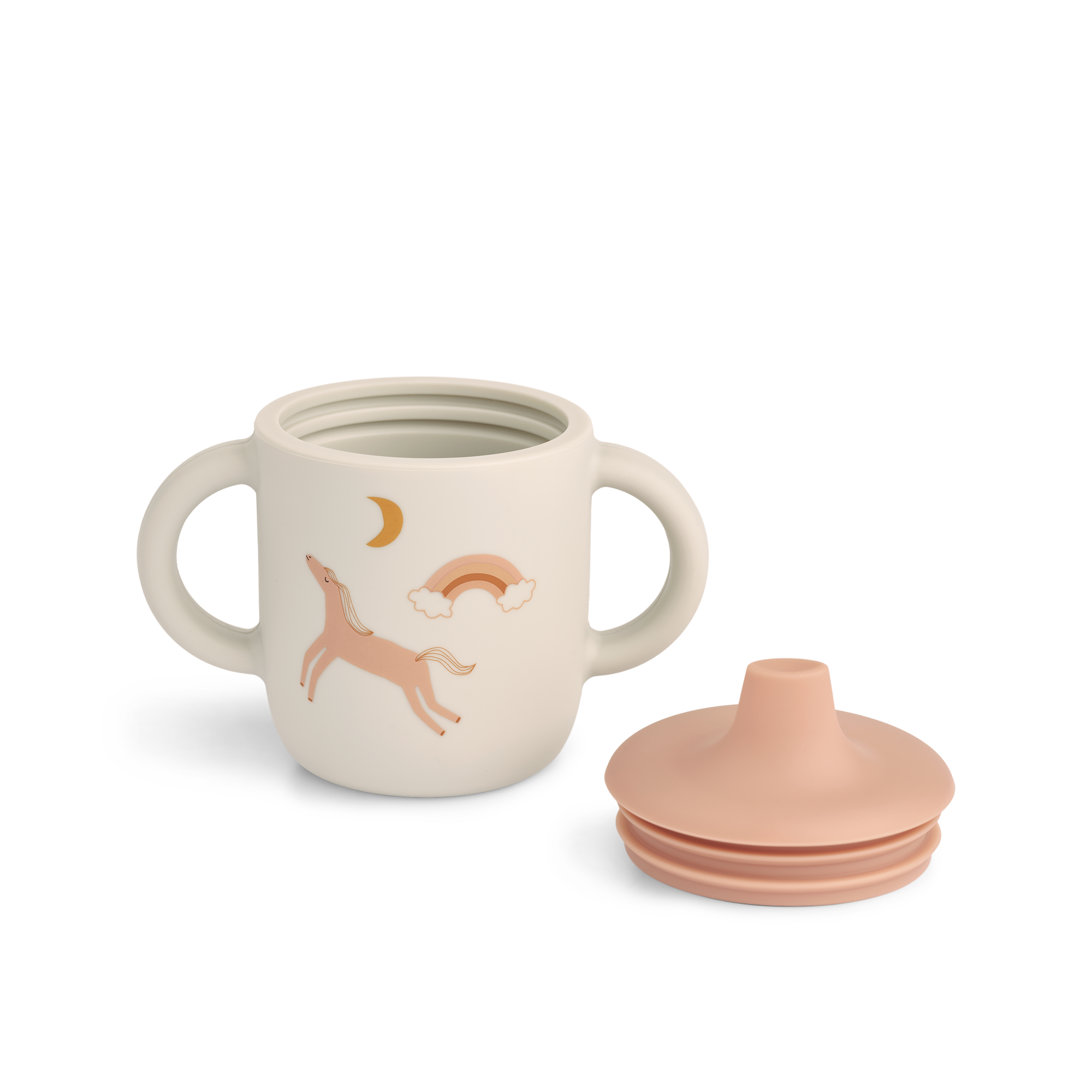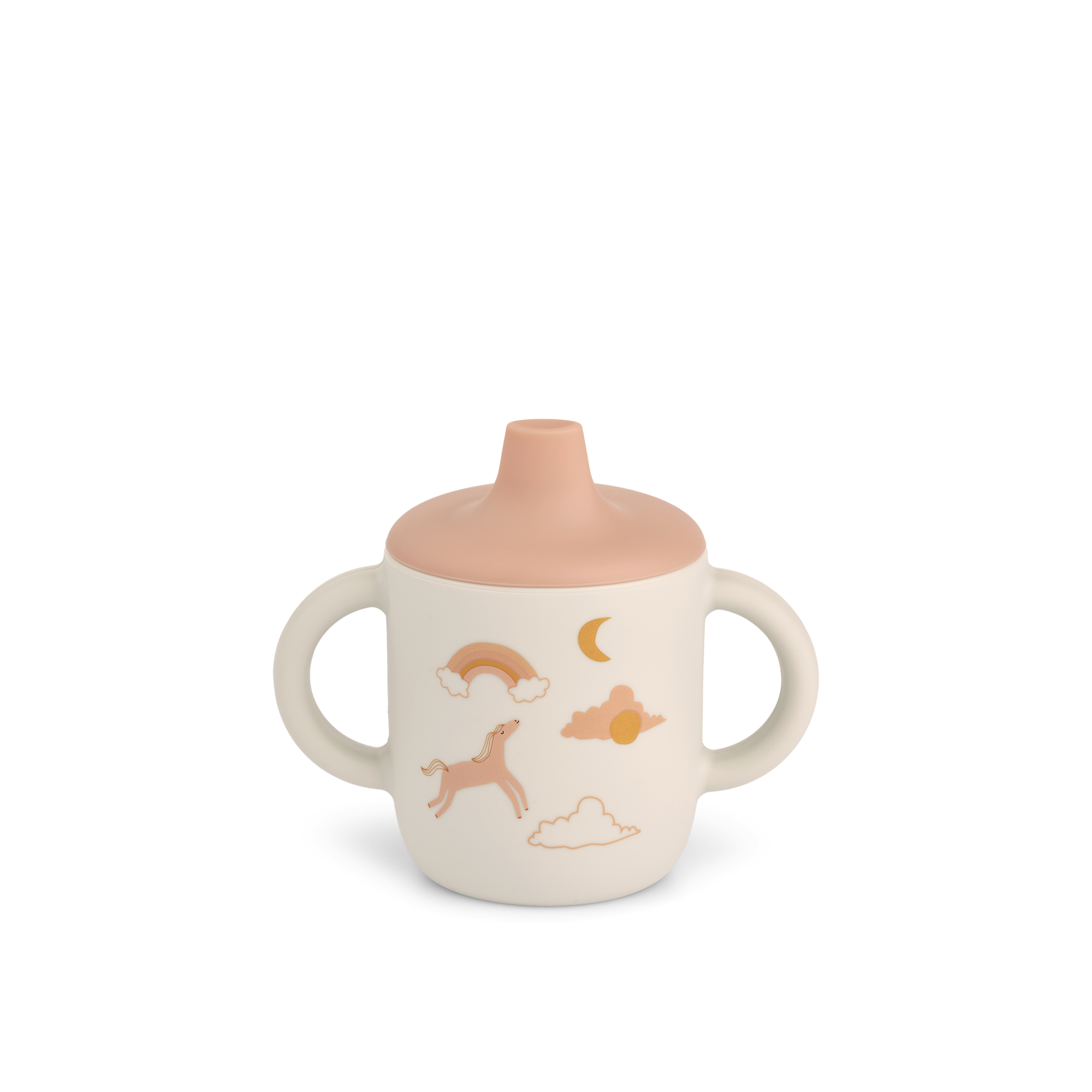 Den søde Neil kop fra Liewood er perfekt, hvis dit barn skal lære at drikke selv. De to håndtag gør den super nem at holde ved og lære at tilte koppen med - det næste skridt på vejen til at drikke fra et almindeligt glas. På koppen er der majestætiske heste og magiske regnbuer - perfekt til små drømmere!