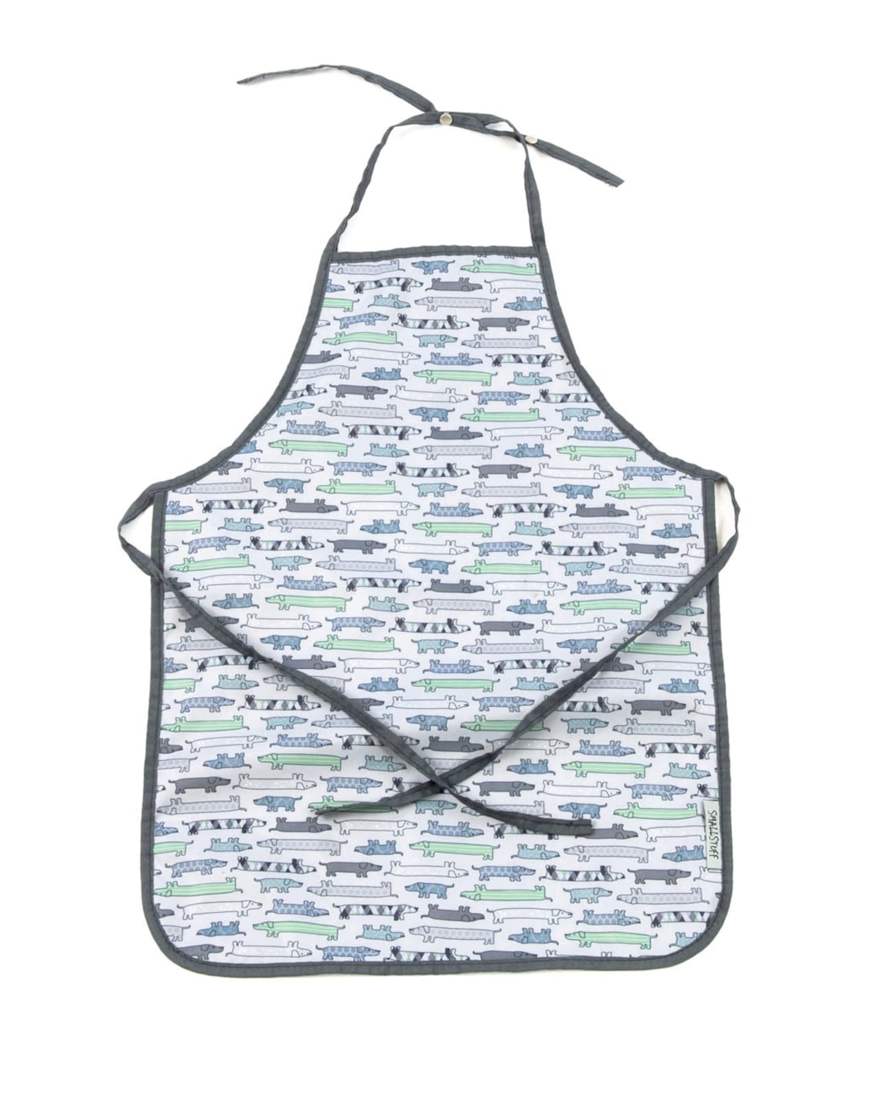 Med et godt forklæde er det ingen sag at lokke junior med i køkkenet! Forklædet her kommer med et skønt hundemotiv i grå toner. Det kan let aftørres med klud og vaskes på 30 grader. Det har praktiske bindebånd og en dejlig blød frotte bagside