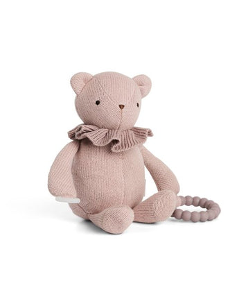 Denne søde og smørbløde aktivitetsbamse i sart rosa med en højde på 19 cm er egnet til børn i alle aldre. I den ene hånd holder den en fastsyet bidering, så der er lindring til ømme gummer. I den anden hånd er der syet en siliconering fast, så man kan sætte en sut i, så den ikke bliver væk. Den oplagte barselsgave!