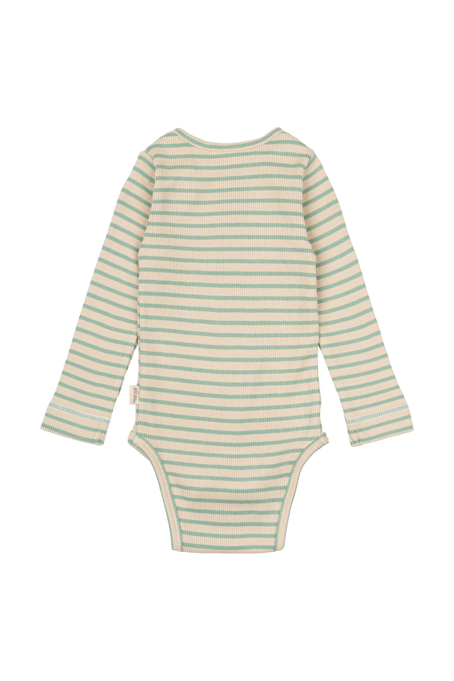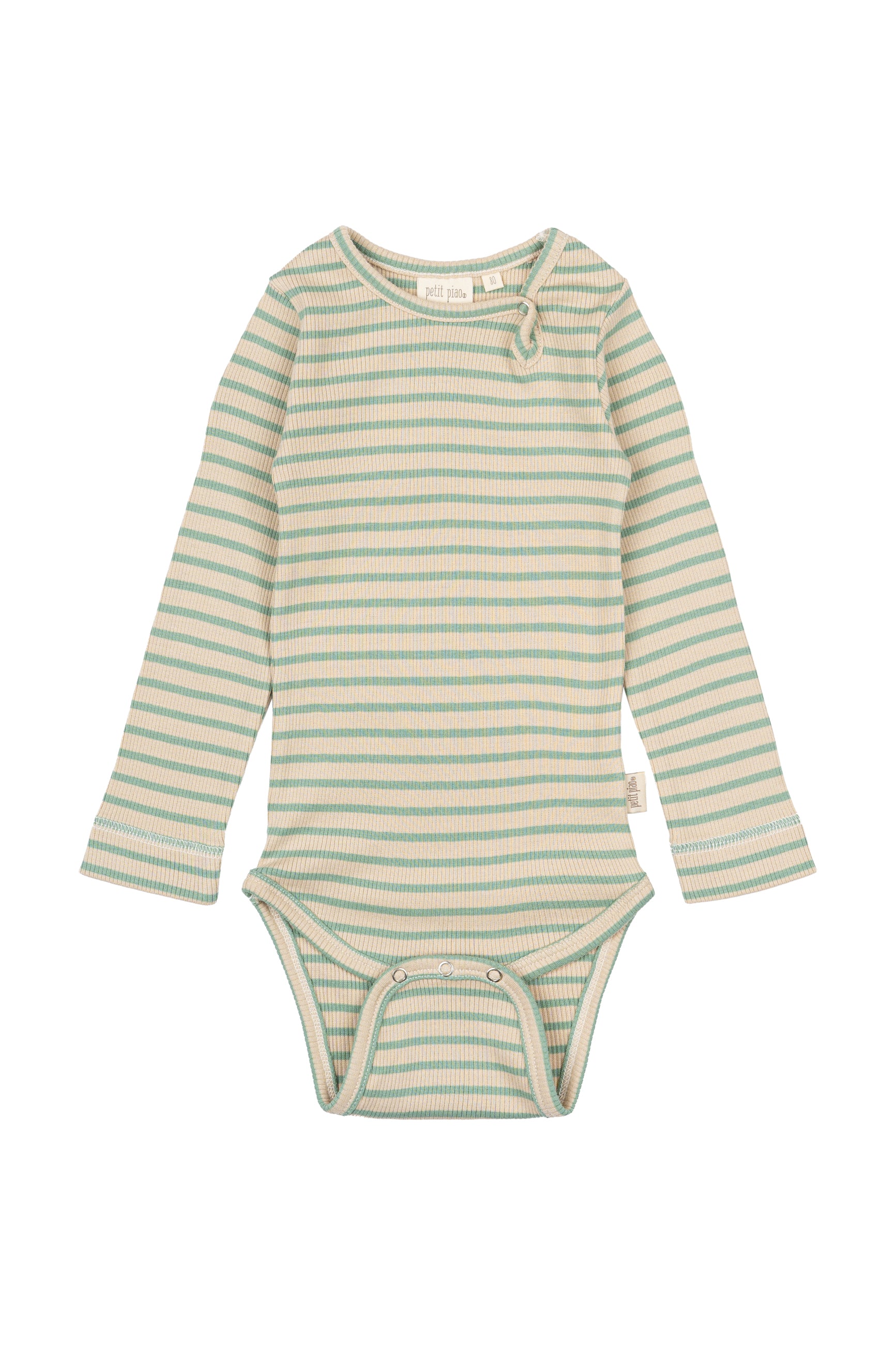 Denne fine stribede body fra Petit Piao i farvekombinationen Granite Green/Dark Off White er både blød, strækbar og perfekt til hverdagsbrug. Fremstillet i en skøn blanding af 48% bomuld, 48% modal og 4% elastan, hvilket gør den let, åndbar og ekstra behagelig mod huden.