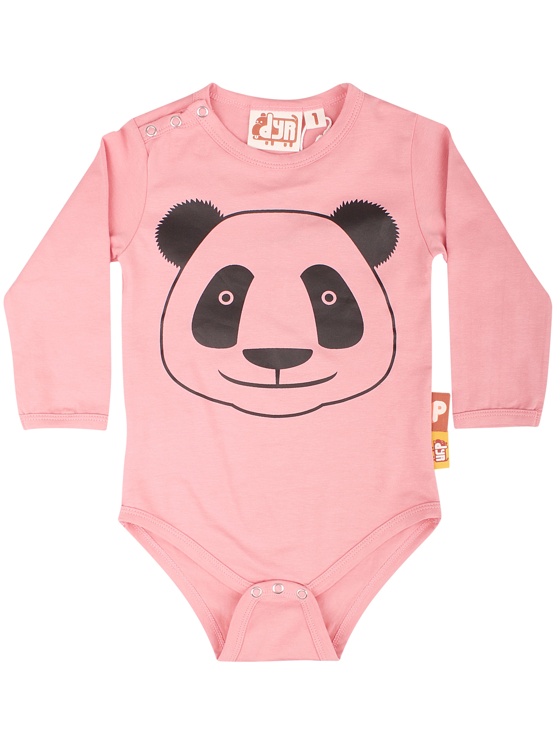 Blød body i skøn rosa - blush pink - med en sød panda på maven. God kvalitet, dejlig blød og rar at have på. Der er trykknapper i kilen og ved højre skulder.