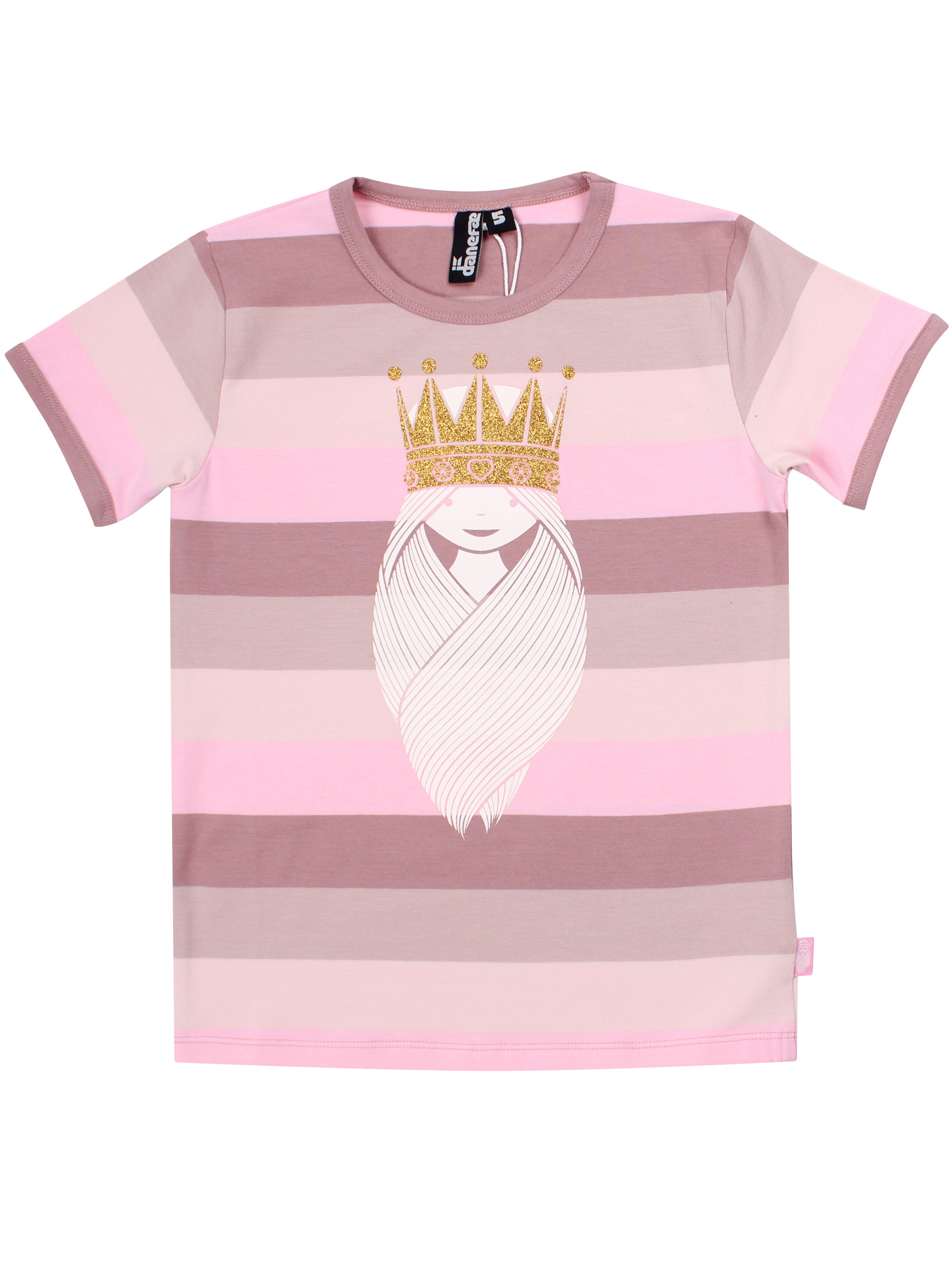 T-shirten har korte ærmer og har fine rosa striber. T-shirten har et flot print af en prinsesse med gylden krone på fronten, der tilfører det der ekstra.