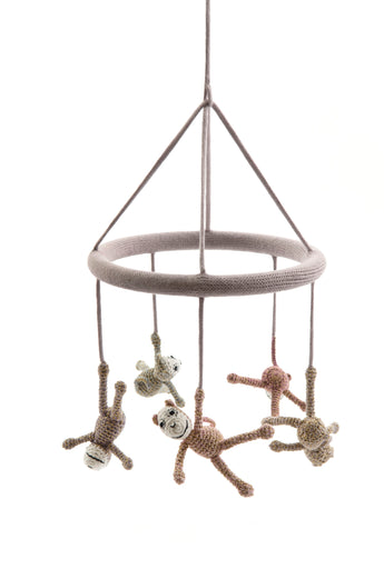 Denne charmerende håndhæklede hængeuro med søde aber er en skøn detalje til børneværelset. Den er lavet med et smukt mix af bomuld og gylden lurex, der giver et fint, glitrende touch.