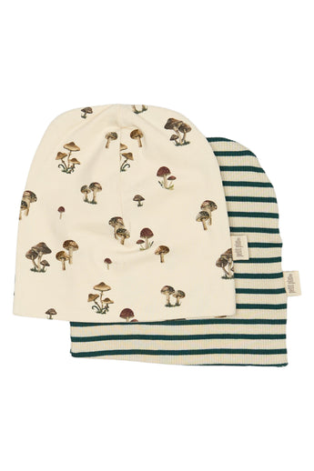 Den ene hue er med et flot mønster, mens den anden har et klassisk stribet design – perfekt til at variere looket. De lette og åndbare materialer gør huerne ideelle til både indendørs og udendørs brug, så barnets hoved holdes lunt og beskyttet året rundt.