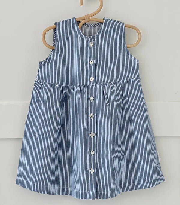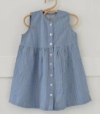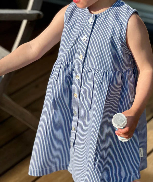 Kjolen har en ærmeløs silhuet, en rund hals og knaplukning hele vejen ned foran. Den stribede vævning giver stoffet liv og struktur, mens det let rynkede skørt tilfører kjolen et sødt og luftigt udtryk med god bevægelsesfrihed.