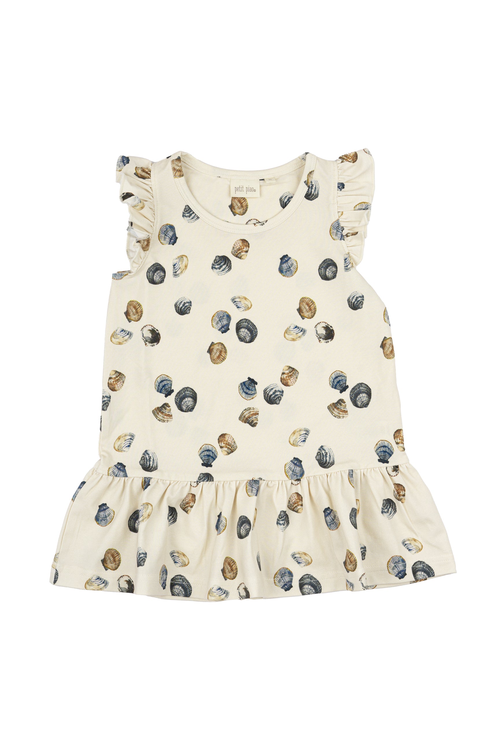 Denne fine kortærmede kjole fra Petit Piao i farven Off White med det smukke Clam print er både blød, strækbar og perfekt til hverdagsbrug. Fremstillet i en skøn blanding af 48% bomuld, 48% modal og 4% elastan, hvilket gør den let, åndbar og ekstra behagelig mod huden.