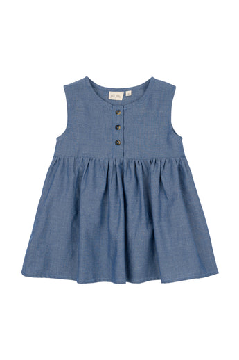 Denne fine ærmeløse kjole fra Petit Piao i farven Denim Blue er både let, luftig og perfekt til varme dage. Fremstillet i 100% bomuld, hvilket gør den blød, åndbar og behagelig for barnet at have på.