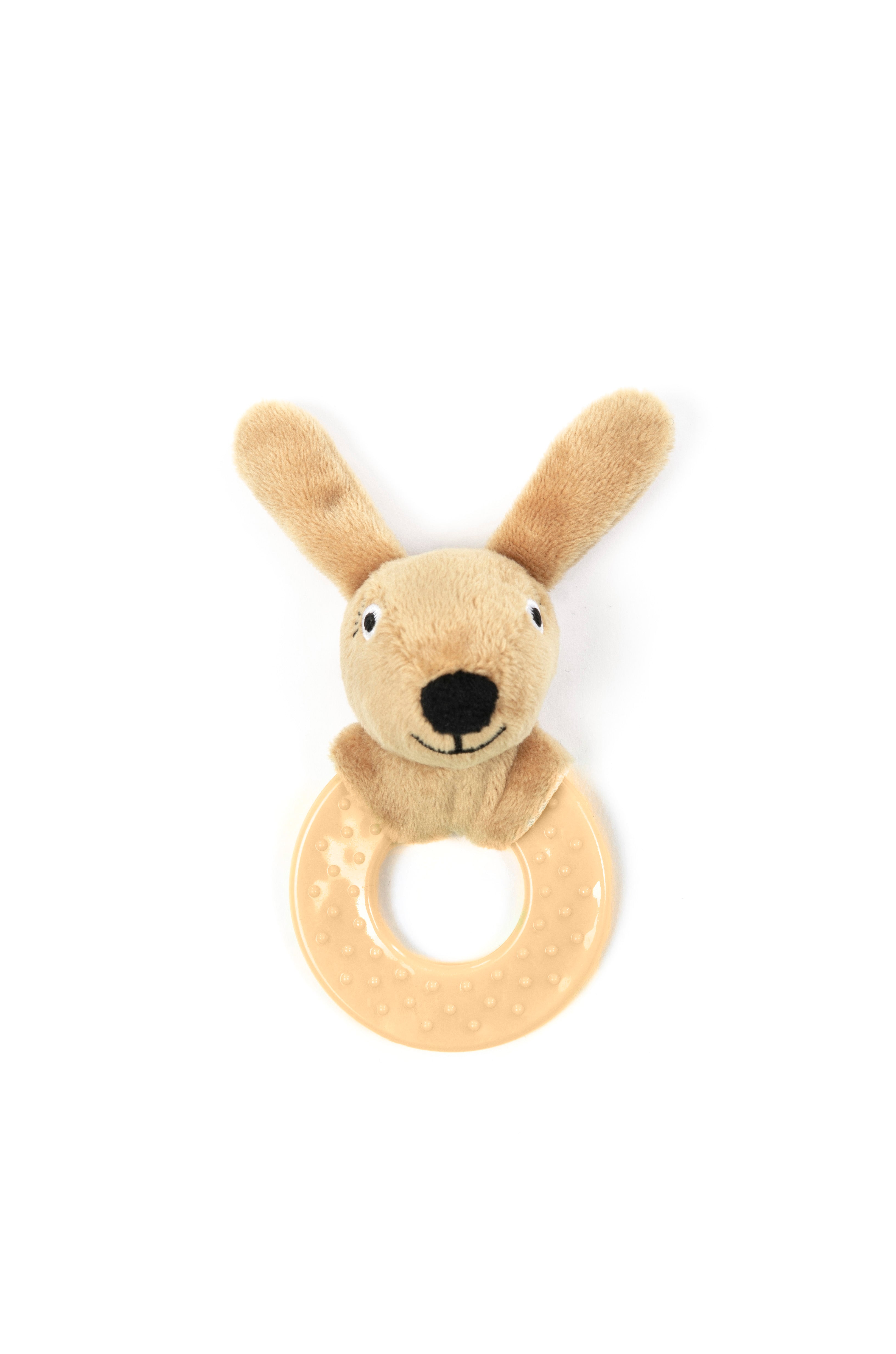 Den smukke hasselfarve giver et varmt, naturligt udtryk, mens bideringen lindrer ømme gummer. Med en størrelse på 13 cm er den let for små hænder at gribe om. Nem at rengøre med en fugtig klud og egnet fra 0+ år.
