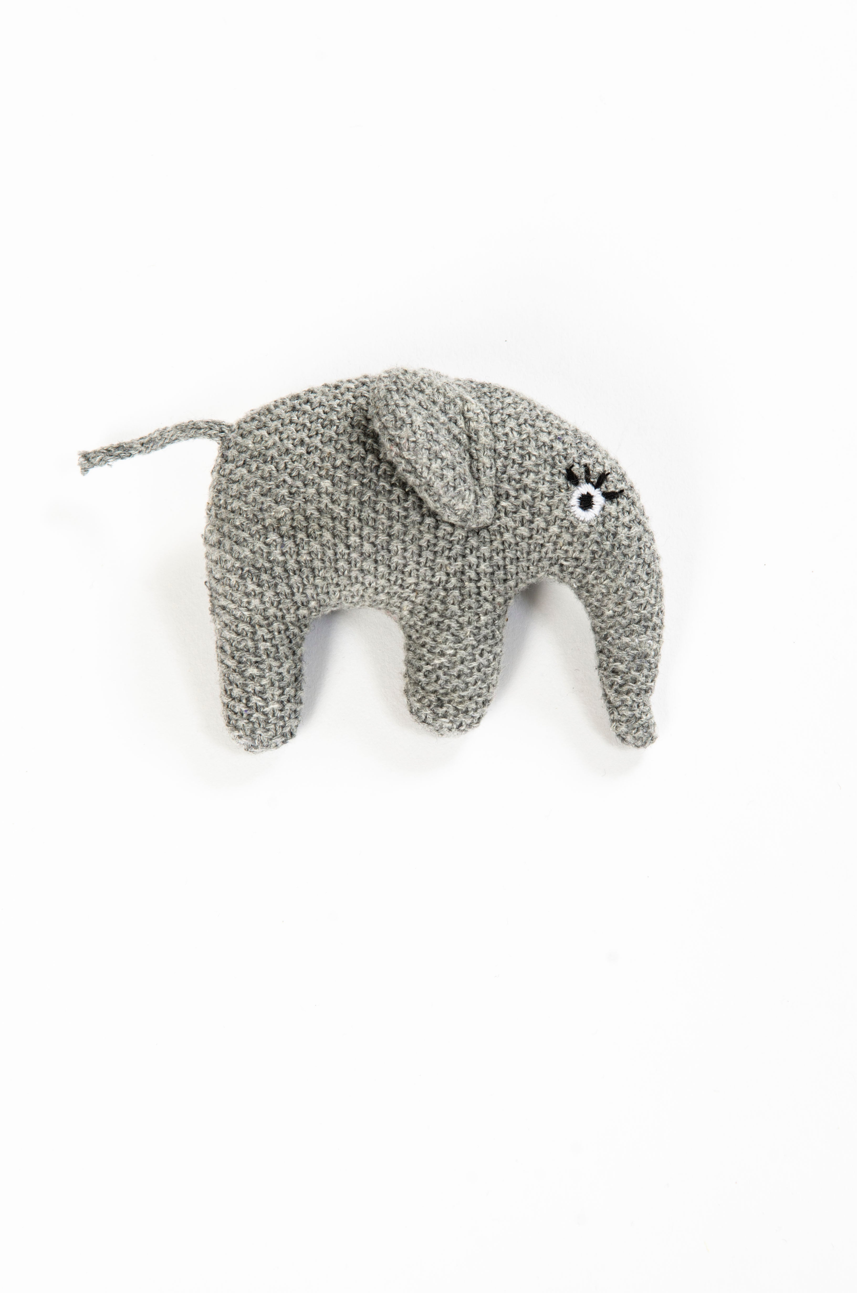 Sød og blød strikket rangle fra Smallstuff. Ranglen har form som en fin elefant - i blødt strik, her i flot grå.