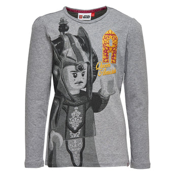 Skøn gråmeleret T-shirt med lange ærmer fra Lego Wear. På maven er der et flot print fra Star Wars samt teksten "Queen Amidala". T-shirten er i lækker kvalitet.