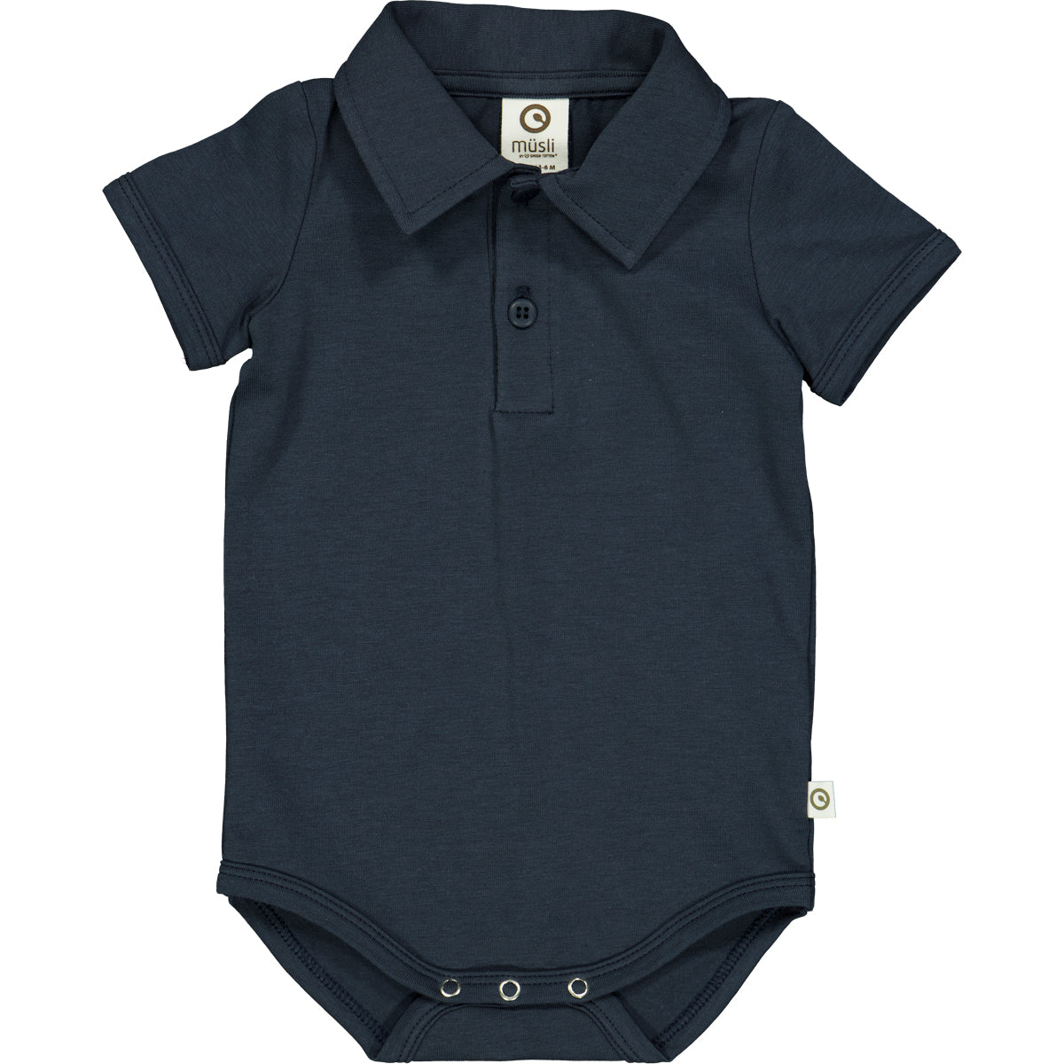 Müsli by Green Cotton - En sød kortærmet body med krave - i navy. Denne body er lavet af blødt og økologisk bomuldsjersey, der sikrer, at dit barn føler sig godt tilpas hele dagen. Den praktiske trykknaplukning gør det nemt at skifte.