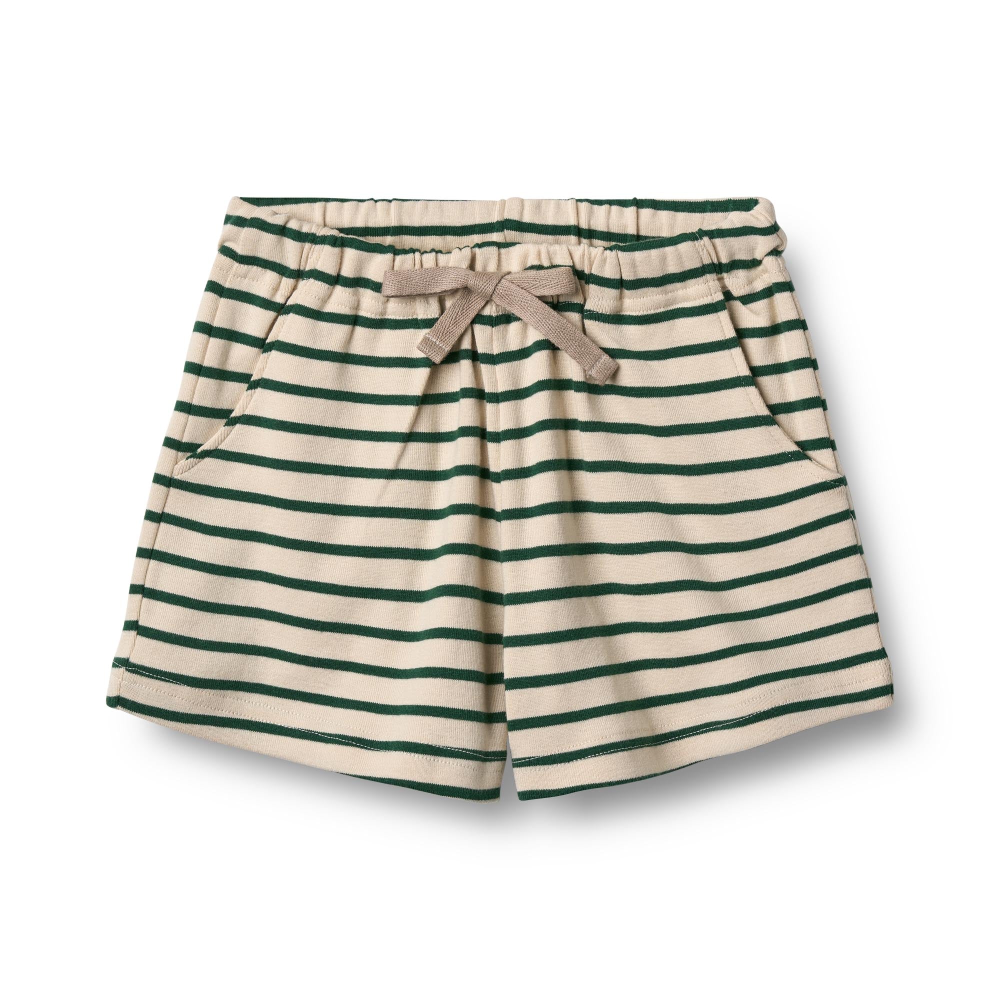 Skønne stribede shorts i farven "green stripe" (beige og mørkegrøn) – perfekte til sommerens varme dage. Modellen har elastik og bindebånd i livet samt lommer i siden.