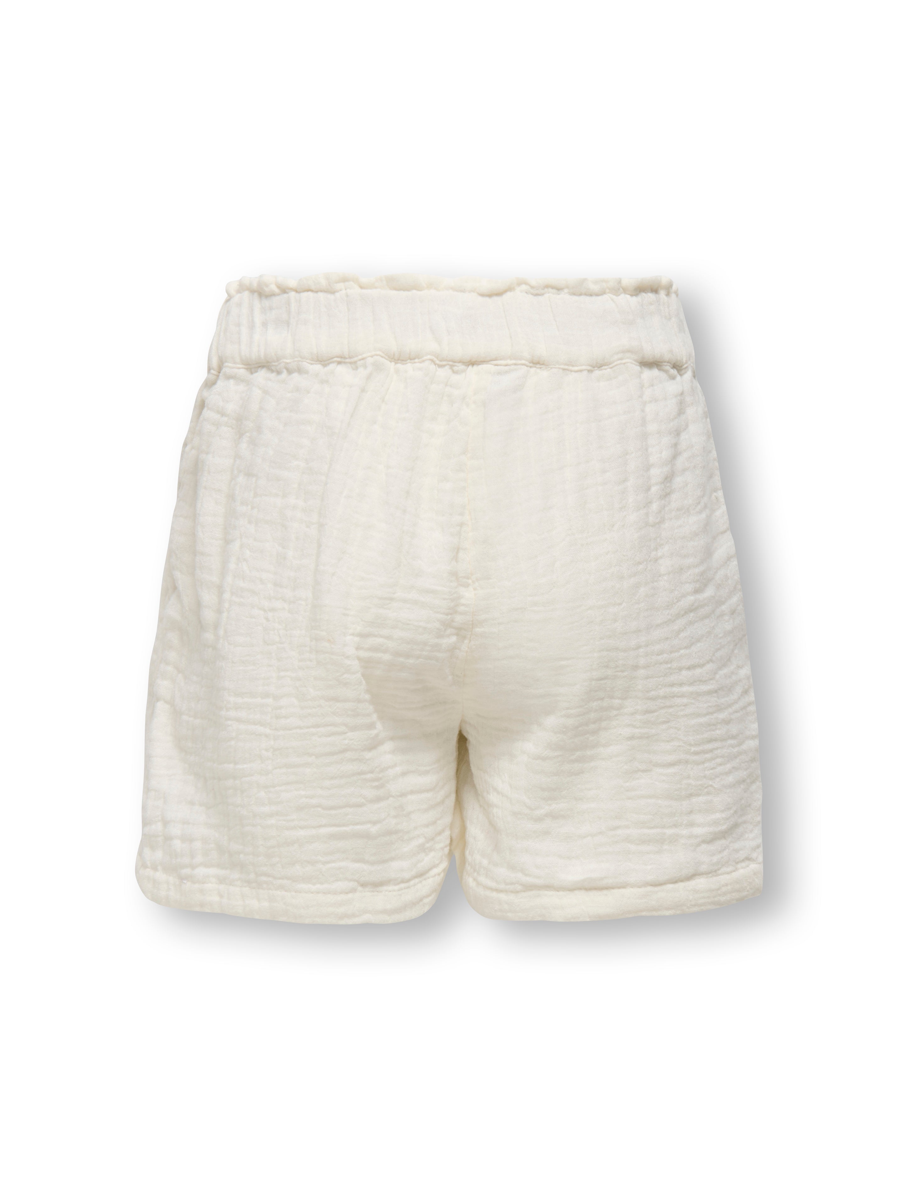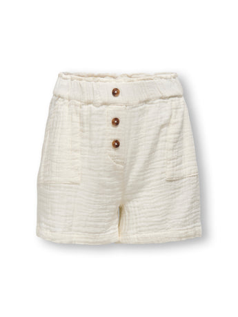 Disse shorts fra Only Girls i råhvid/tofu er et perfekt valg til de varme dage. Med den lette og luftige kvalitet er de ideelle til både afslapning og leg. De har en elastisk talje, der sikrer en god pasform og komfort hele dagen, samt fine knapdetaljer og praktiske lommer, der giver shortsene et både afslappet og stilfuldt udtryk. Den naturlige, lyse farve gør dem nemme at kombinere med forskellige tops og skjorter.