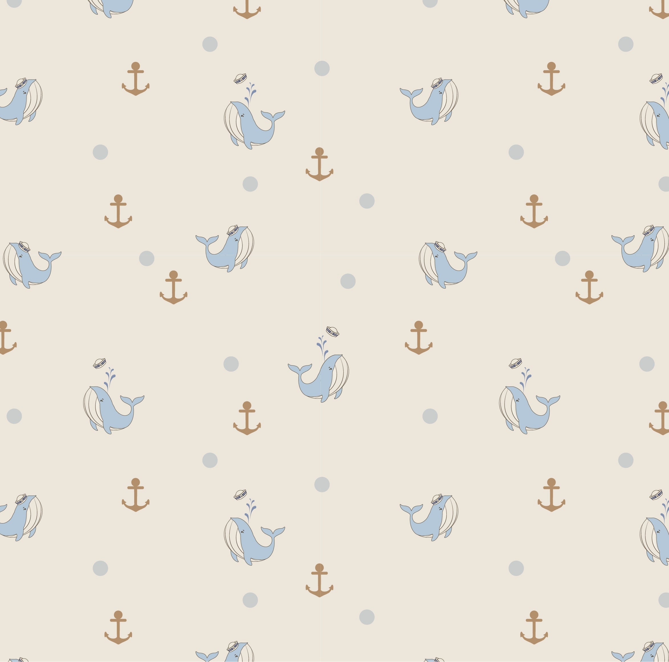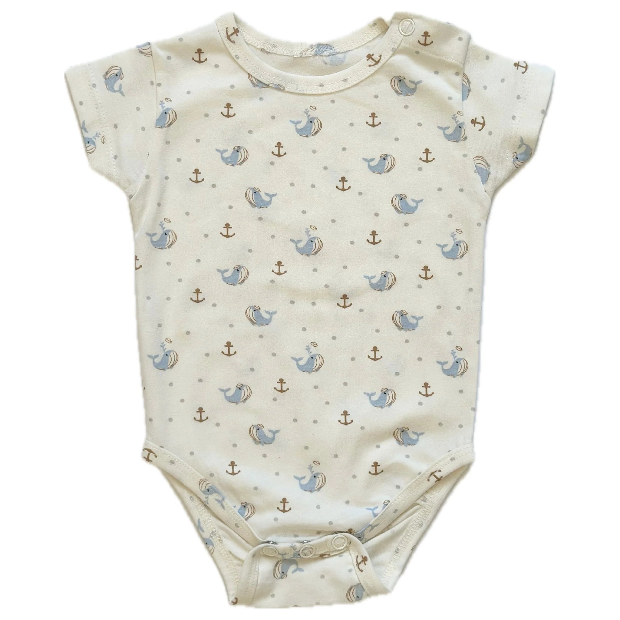Det maritime print med små hvaler og ankre på en varm cremefarvet bund tilfører et legende og klassisk udtryk. Bodyen har kuvertlukning ved skuldrene og trykknapper forneden, som gør den nem at tage af og på – praktisk i en travl hverdag.