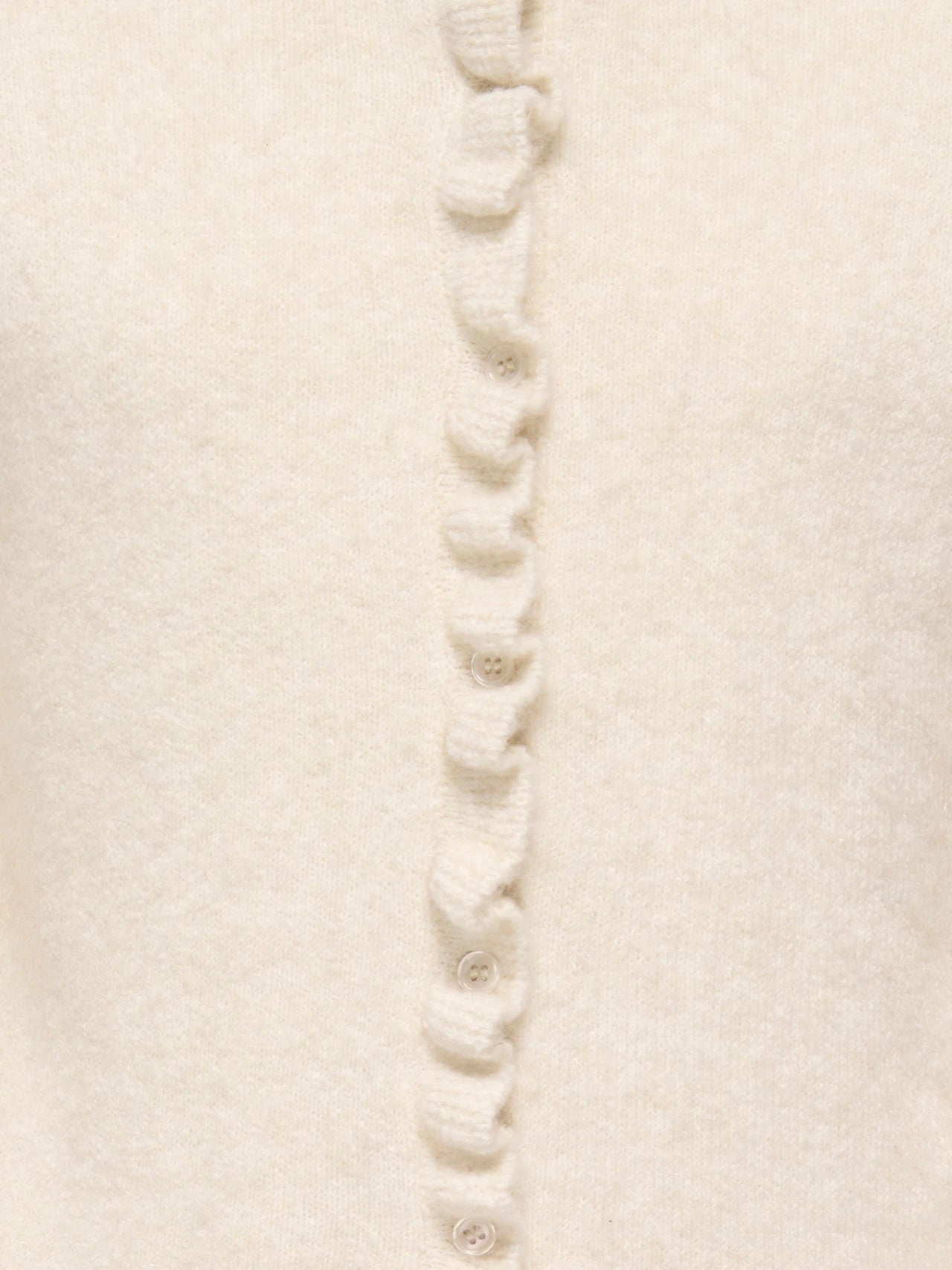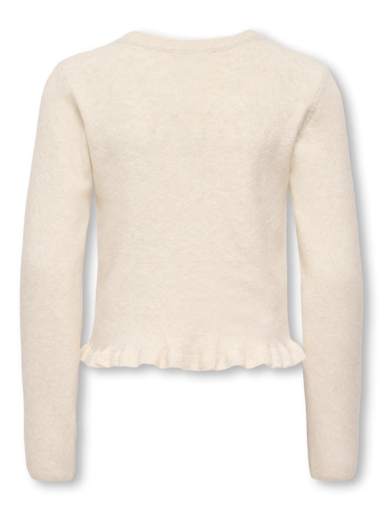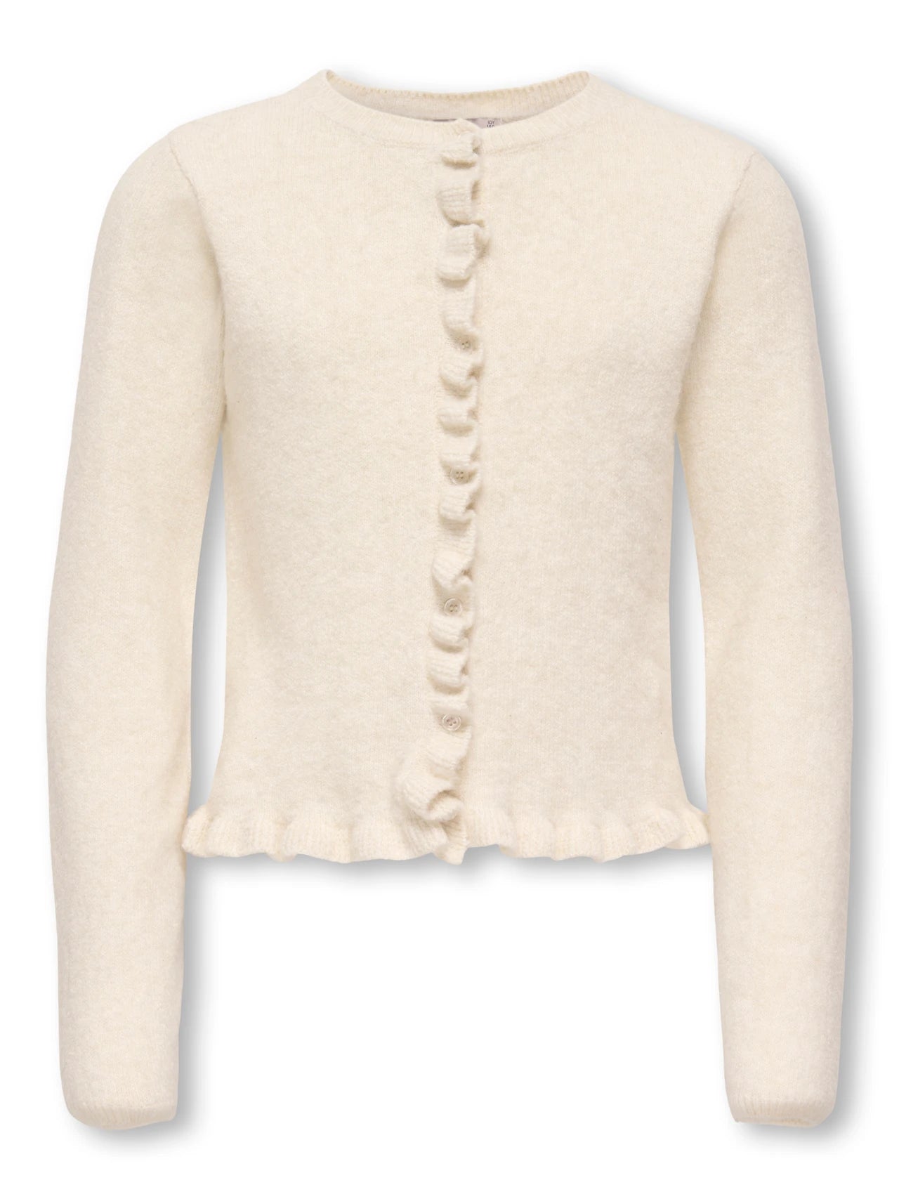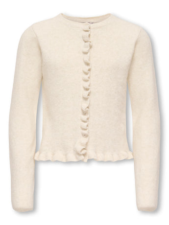 Blød cardigan fra Only Girls i den flotte neutrale farve Birch. Cardiganen har et tidsløst design med fine ruflede kanter og smukke lyse knapper, der giver et flot feminint og elegant udtryk. Oplagt til de kolde vintermåneder eller som ekstra lag til sommeraftnerne.