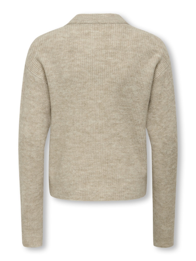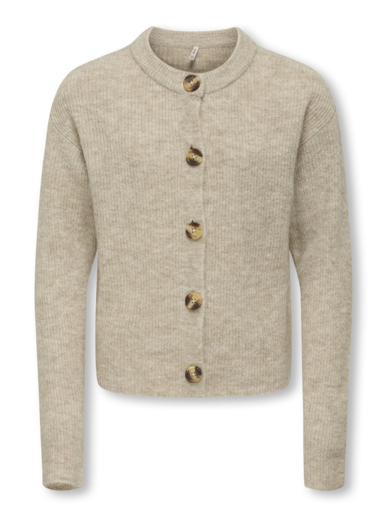 Denne bløde cardigan fra Only Girls er en hyggelig og tidløs style, der kombinerer komfort med et moderne udtryk. Den har en let oversized pasform med rund hals og store knapper foran, som giver et feminint og afslappet look. Den lyse farve *pumice stone* tilfører et roligt og klassisk udtryk, der gør den nem at matche med både jeans, kjoler og nederdele – perfekt til både skole, hverdag og hyggelige weekender.
