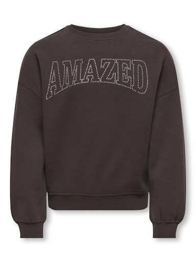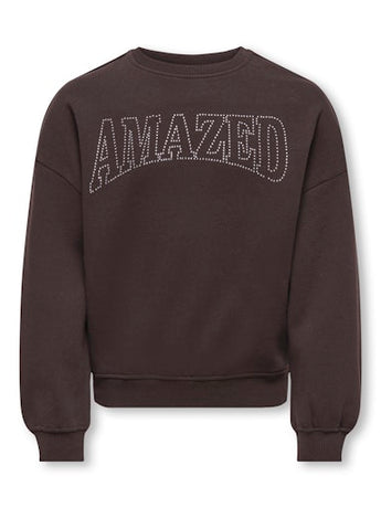 Denne mørkebrune sweatshirt fra Only Girls i farven Black Coffee, er både stilren og komfortabel. Fronten er pyntet med glitrende rhinsten, som tilsammen danner ordet "Amazed" - et sjovt men stadig stilfuldt touch. Sweatshirten er fremstillet i det blødeste bomuld, som sikrer varme og komfort hele dagen - så mangler din dag også lidt ekstra glimmerglitter, så pift den op med denne skønne sweatshirt.