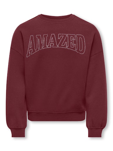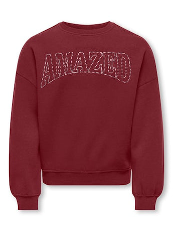 Denne røde sweatshirt fra Only Girls i farven Cabernet, er både cool og komfortabel. Fronten er pyntet med glitrende rhinsten, som tilsammen danner ordet "Amazed" - et sjovt men stadig stilfuldt touch. Sweatshirten er fremstillet i det blødeste bomuld, som sikrer varme og komfort hele dagen - så mangler din dag også lidt ekstra glimmerglitter, så pift den op med denne skønne sweatshirt.