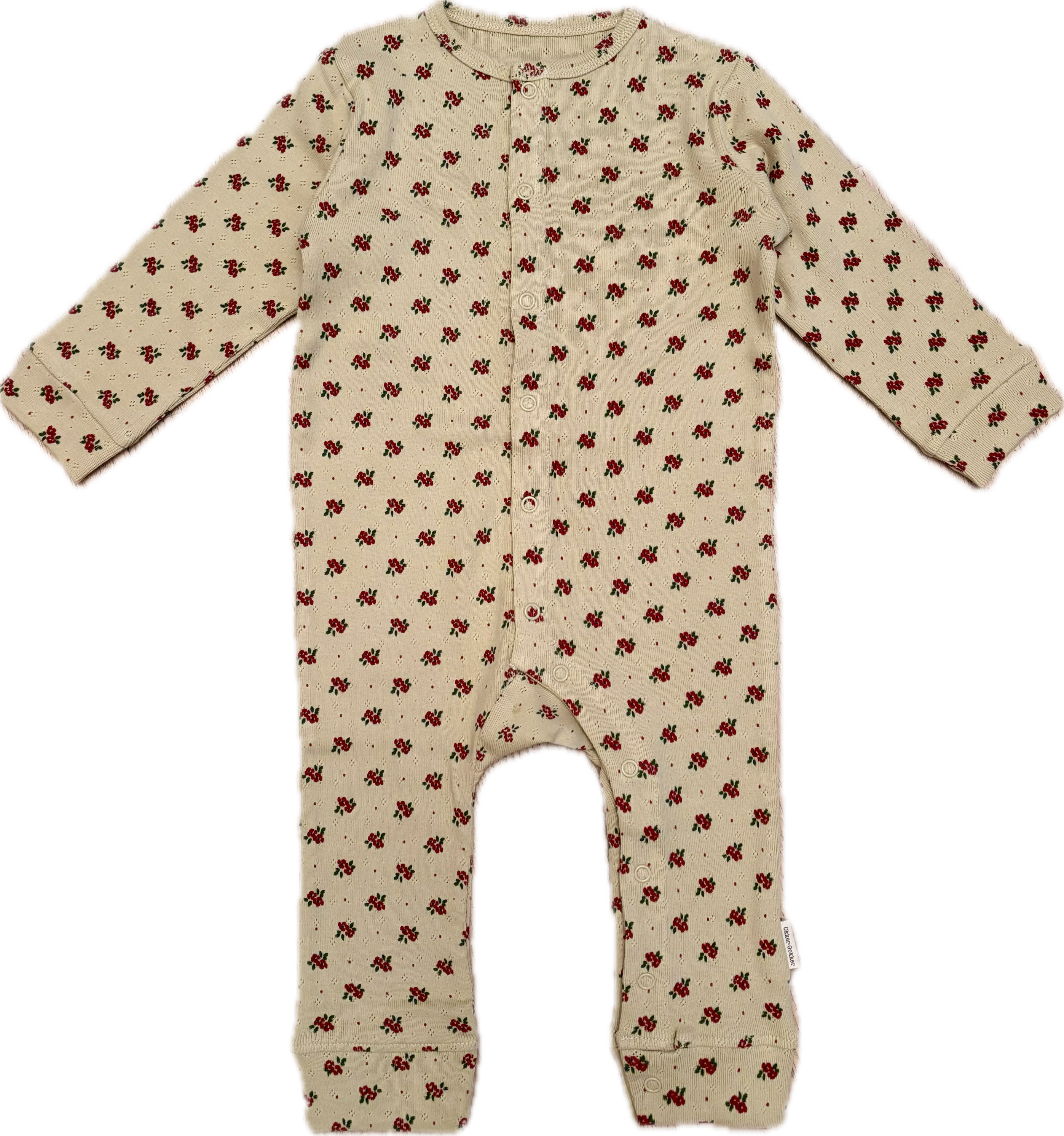 Natdragt med lange ben og ærmer i en blød pointelle-strikning i økologisk bomuld med et sødt blomsterprint: ”autumn bloom”. Dragten har en praktisk knaplukning hele vejen ned til anklen for hurtig adgang, så den er nem at få af og på. Den økologiske bomuld gør dragten let og åndbar - perfekt til sovetid og lange morgener.