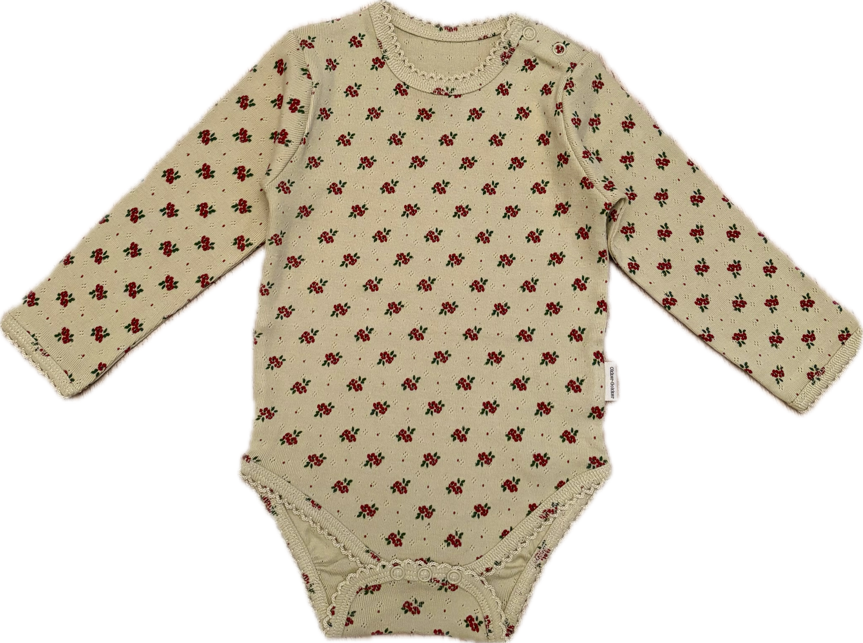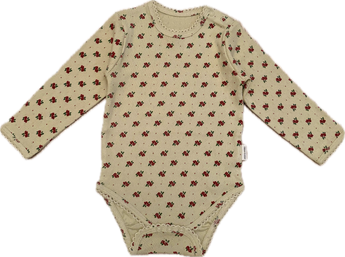 Bodystocking i en blød pointelle-strikning i økologisk bomuld med sødt blomsterprint: ”autumn bloom”. Denne body har knapåbning ved skulderen så den er nem at få af og på. Det økologiske bomuld er ultra blødt for at sikre en god og fleksibel pasform, der følger barnets bevægelser.