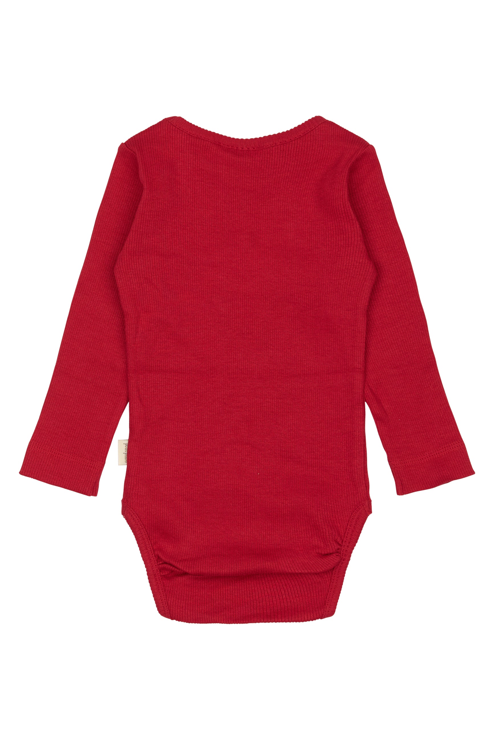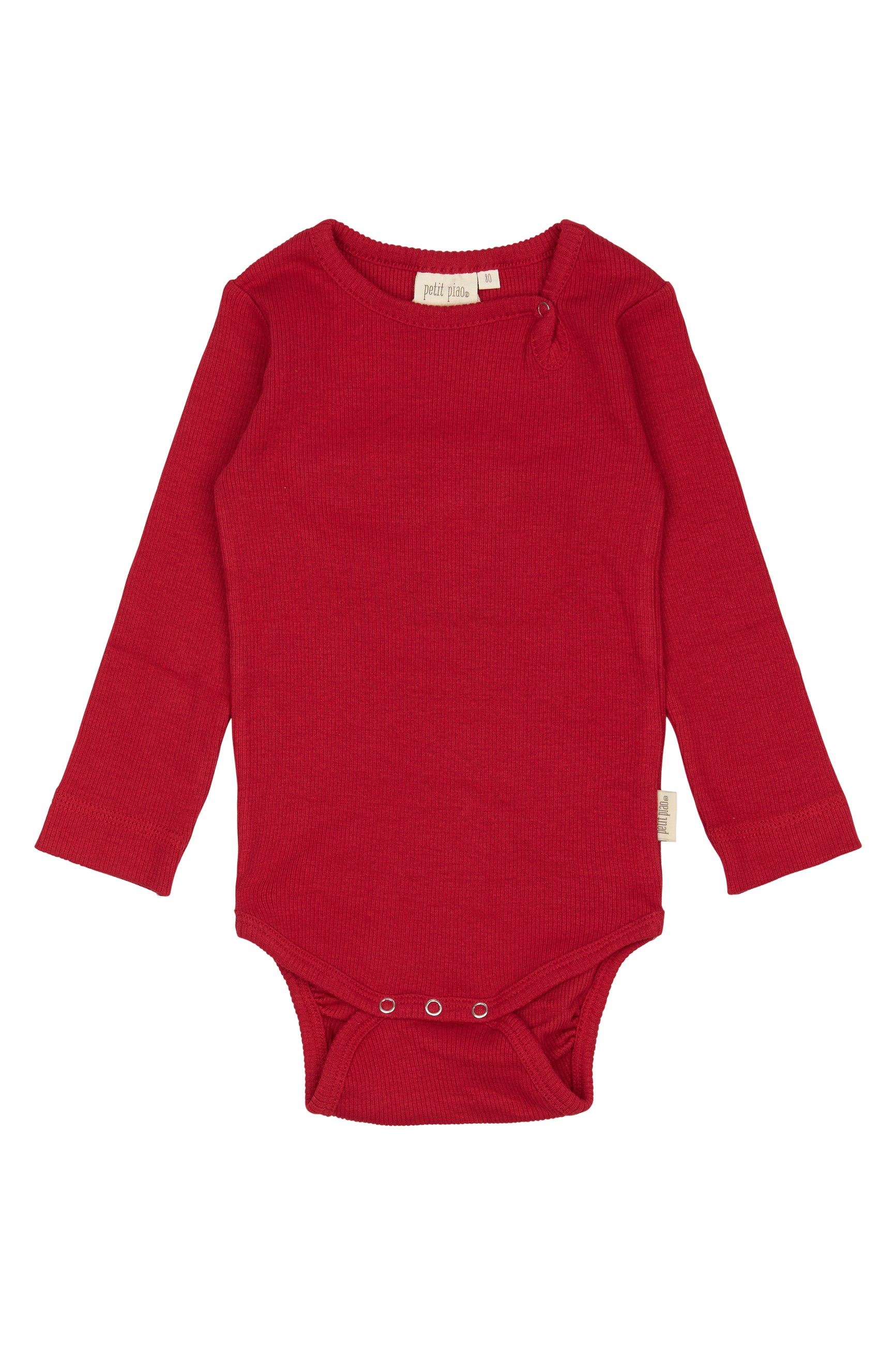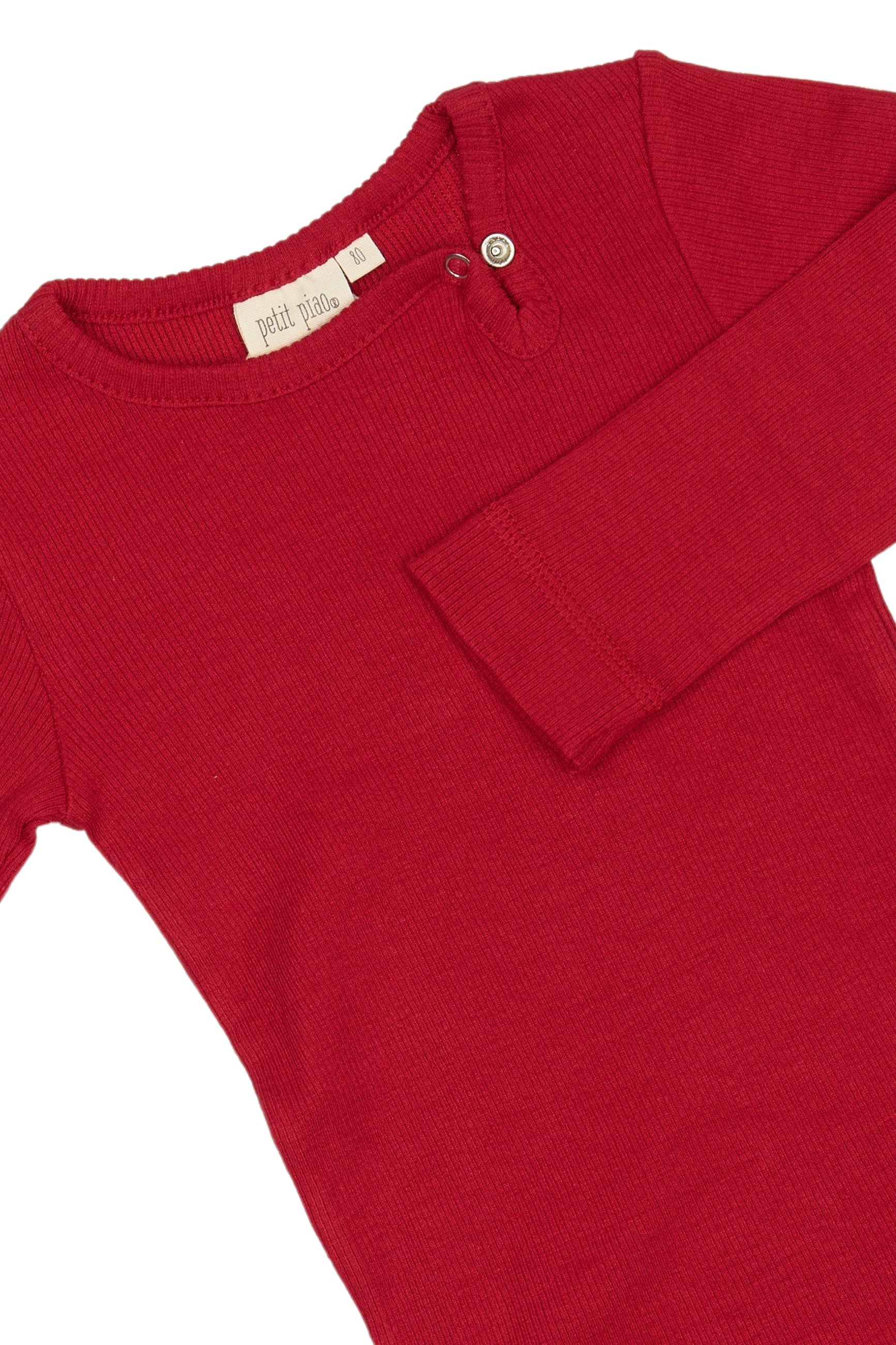 Denne bløde og behagelige langærmede body fra Petit Piao kommer i den flotte, dybe røde nuance Jet Red. Den ribbede kvalitet gør bodyen både strækbar og komfortabel – perfekt som inderste lag på kolde efterårs- og vinterdage. Brug den alene under en varm cardigan, eller style med leggings, bukser eller en heldragt for et hyggeligt og praktisk outfit.