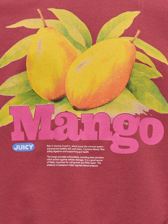 Denne fede sweater er ikke til at stå for! Med et cool, retro gummiprint med en mango og et sjovt print med information om mango på brystet er stilen virkelig lagt her. Style sweateren med leggings eller jeans for et afslappet outfit til hverdag.