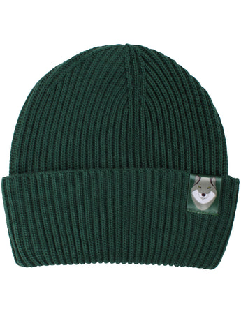 Varm, sød og dejlig blød beanie til børn i mørkegrøn med et lille logo af en ulv.