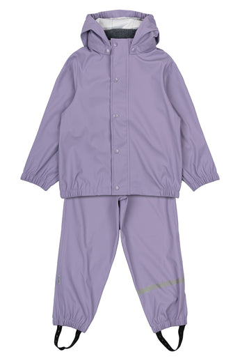 Dette klassiske regnsæt fra Mikk-Line i farven Dusk er både praktisk, slidstærkt og perfekt til regnfulde dage. Fremstillet i en kombination af 66% genanvendt polyester og 34% polyurethan, hvilket gør det vandtæt, fleksibelt og behageligt at bevæge sig i.