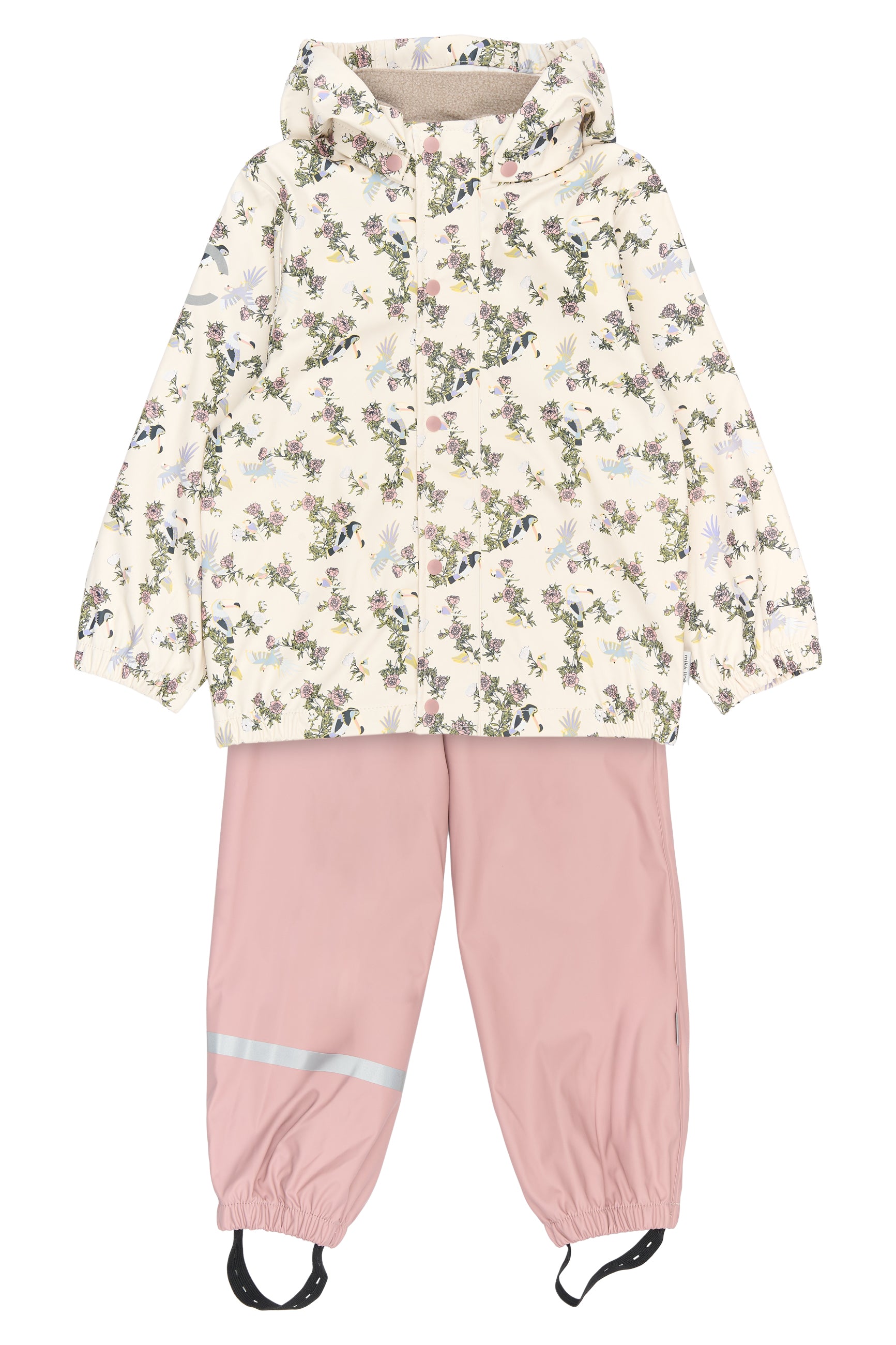 Dette skønne regnsæt fra Mikk-Line i farven Woodrose er både praktisk, slidstærkt og perfekt til regnfulde dage. Sættet består af en lyserød regnbuks og en regnjakke med et flot blomster- og tukanprint, der giver et sødt og legende udtryk, og så skifter det farve, når det bliver vådt!
