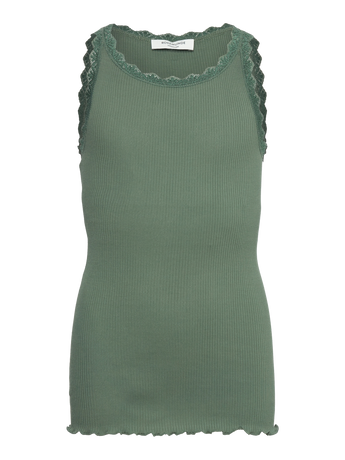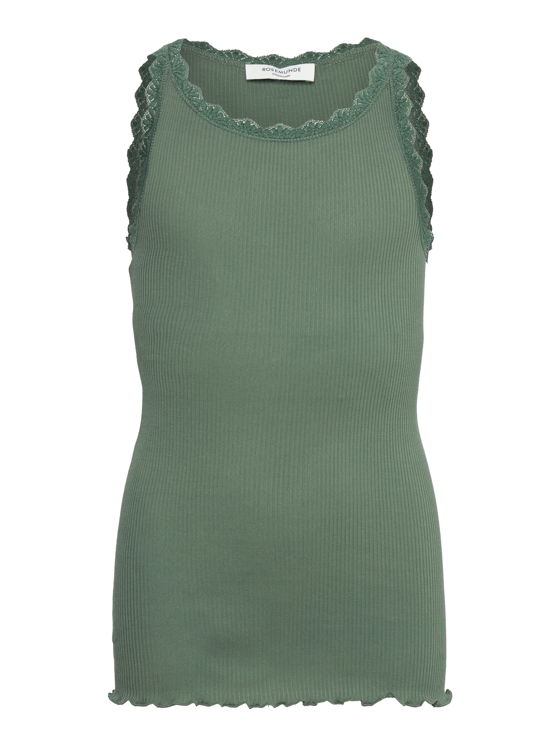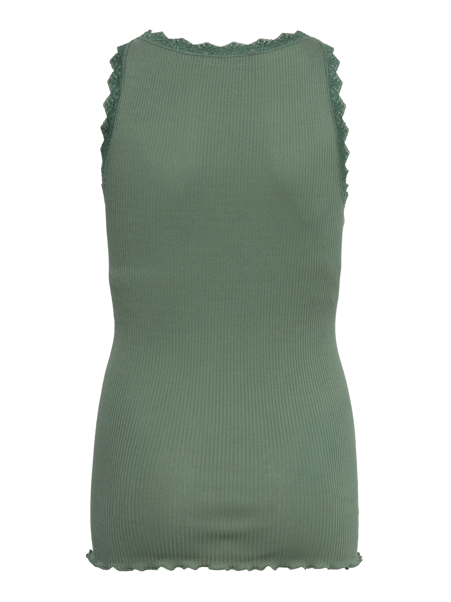 Denne smukke ribtanktop fra Rosemunde er en ægte klassiker med feminine detaljer. Den har fine blondekanter ved halsudskæring og ærmeåbninger, som giver et elegant og tidløst look. Den bløde og elastiske ribkvalitet gør toppen utrolig behagelig at have på og perfekt både alene på varme dage eller under en cardigan eller blazer. Den dæmpede grønne farve giver et frisk og naturligt udtryk, der passer til mange styles.
