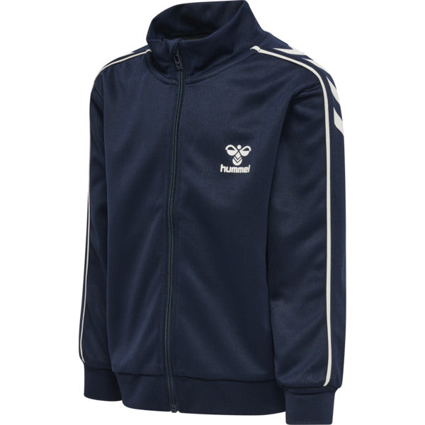 Lækkert Hummel træningssæt, der består af en cardigan og et par træningsbukser i black iris. Ned ad ærmerne og buksebenene er der hvide pipings samt hvide vinkler trykt øverst.