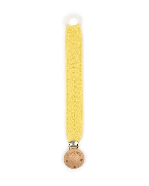 Hold styr på sutten med denne fine suttesnor fra Smallstuff. Suttekæden er i blødt sildebensstrik i fin lys gul.