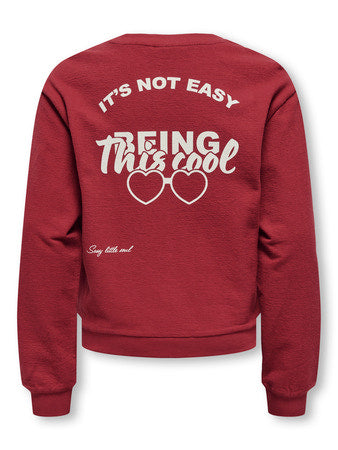 Denne røde sweatshirt har et lille hjerteprint foran og stort tekstprint bagpå med motiver af solbriller og statement-tekst ("it's not easy being this cool"). Sweateren har almindelig pasform, klassisk rund hals og sænkede skuldersømme - perfekt til hverdagsoutfittet det meste af året!