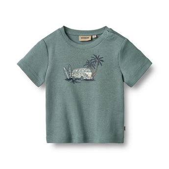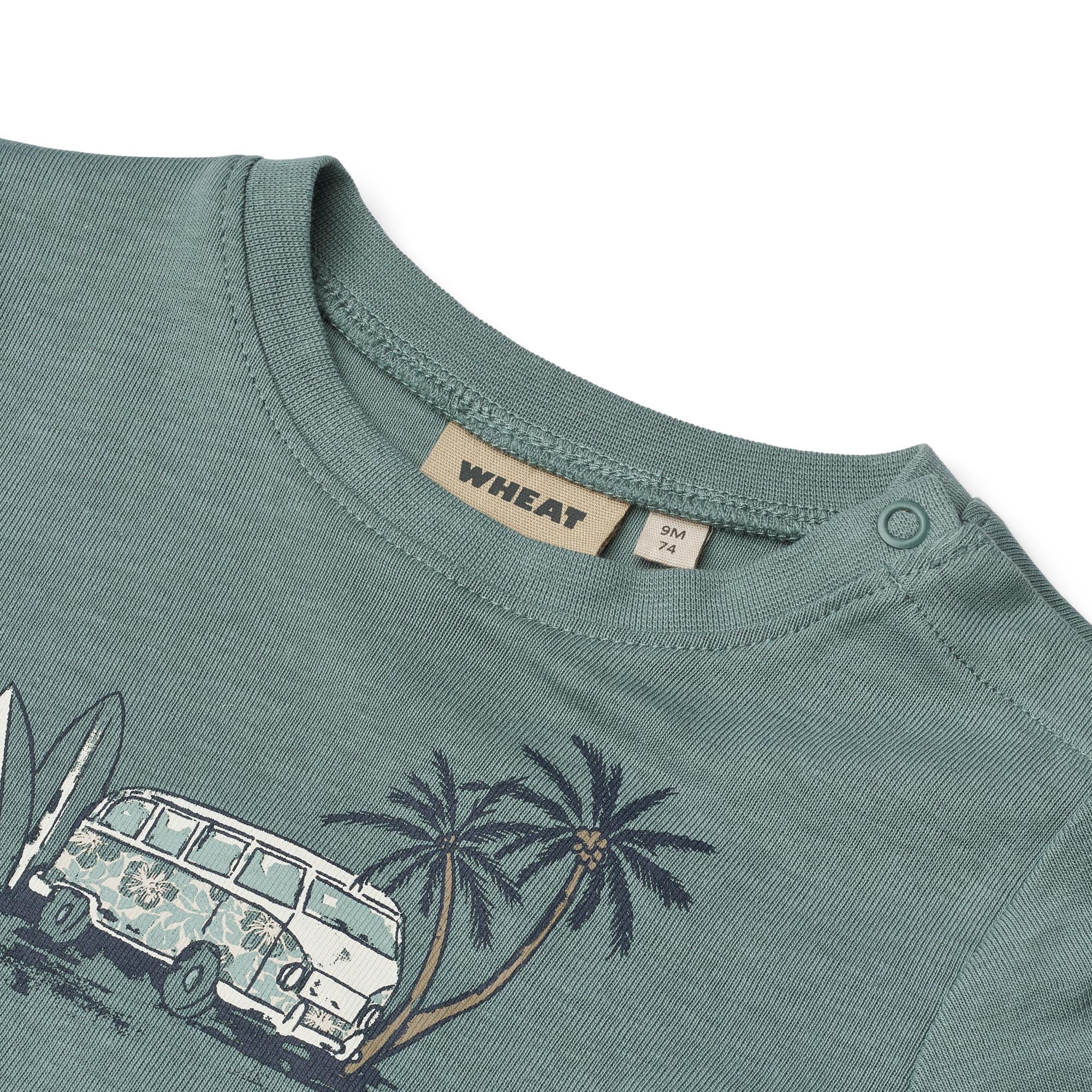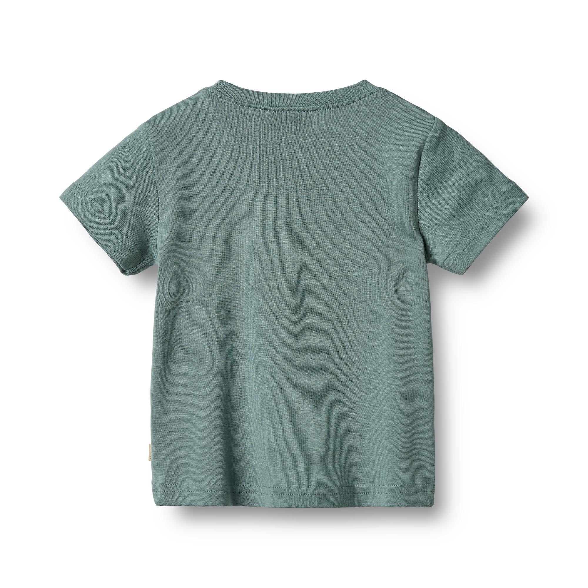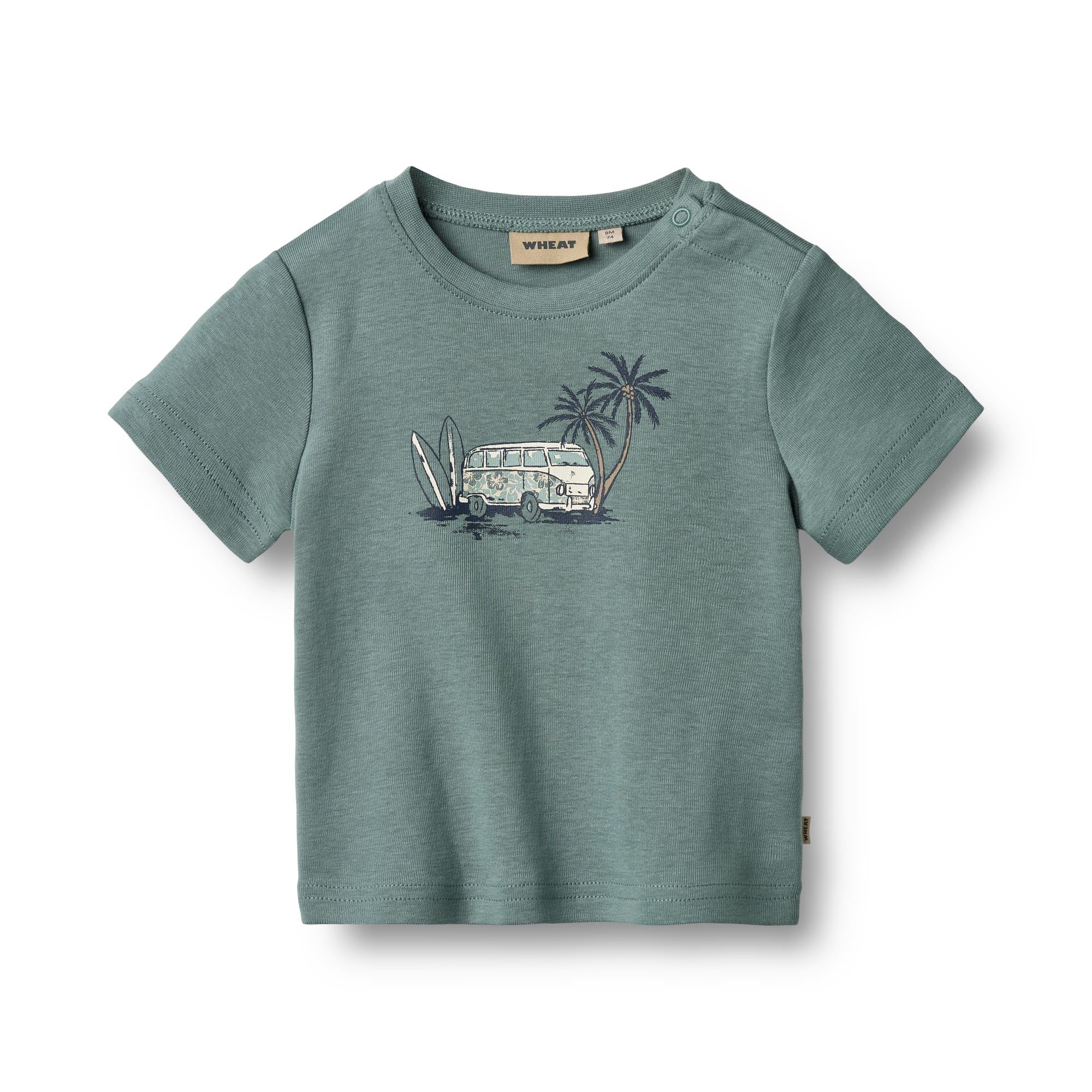 Blød og behagelig t-shirt fra Wheat i farven "Stormy Sea". En enkel og klassisk kortærmet model i økologisk bomuldsjersey med et skønt print på – perfekt til hverdagens aktiviteter og leg.