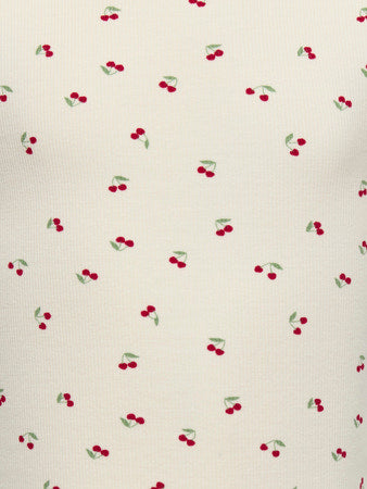 Så er der sødt med sødt på! Den bedårende top med kirsebær er perfekt til en sød sommerpige, der elsker finurlige detaljer. Toppen har en tæt pasform, kommer i en æggeskalshvid farve ("tofucherry") og har fine riflede detaljer ved ærme og taljekant.