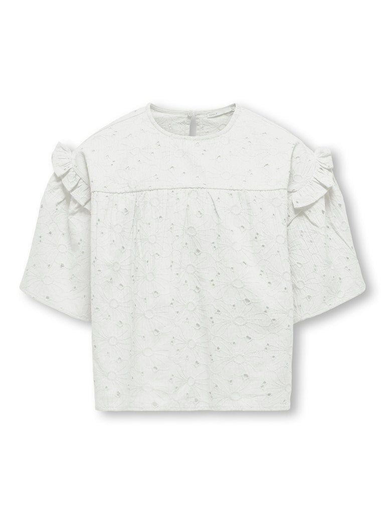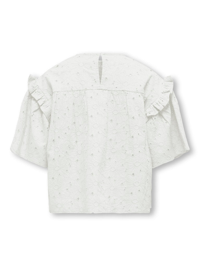 Denne yndige bluse med smuk broderi anglaise, flæser og knaphul i nakken er helt uimodståelig og det perfekte valg til en alsidig garderobe! Pasformen på den søde overdel er normal og ærmerne er 3/4-ærmer - let og luftigt, lige som man vil have det!