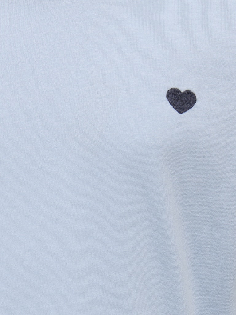 Denne søde T-shirt i en fin blå farve har et lille mørkeblå broderet hjerte over brystet. Pasformen på den fine overdel er let oversize med en let "cropped" længde og sænkede skuldersømme. Helt ideel som basic tee til den unge pige!