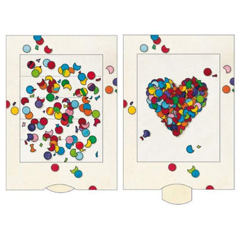 Smukt træk-ud dobbelt postkort - Konfetti hjerte , der ændrer motiv når man trækker i slippen. Kortet med farverig konfetti der bliver til et smukt hjerte.