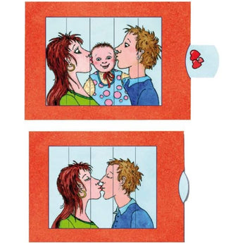Smukt dobbelt træk ud postkort - Kys, der ændrer motivet, når det trækkes.  Dette interaktive kort illustrerer når et kys bliver til en baby, som skaber en familie.