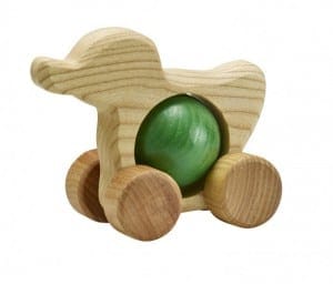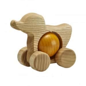Lille, søde, nysgerrig and med gul rullekugle, som drejer når barnet går tur med den. Den er både for de mindste og for de lidt større, fremstillet af bæredygtige materialer med respekt for mennesker og miljøet. Den er i beige og gul, men kan også fås med blå, grøn og rød kugle. Hver eneste er bare unik, da de er både håndlavet og håndmalet.