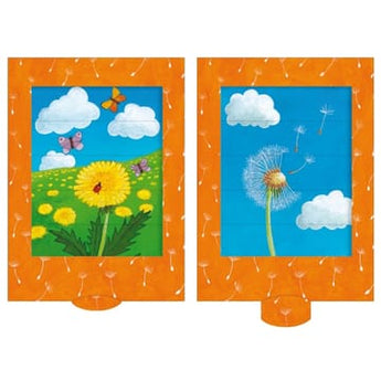 Sjovt træk-ud dobbelt postkort - Mælebøtte, der ændrer motiv når man trækker i slippen. Dette interaktive kort illustrerer sommerfugle og mælkebøtter, som kan pustes i alle retninger, når man bare trækker i slippen af blomstren.