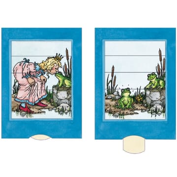 Meget sjovt  træk-ud  dobbelt postkort -Princessen og frøen, der ændrer motiv når man trækker i slippen. Prinsesse  kysser en frø, i håbet om at han bliver til en prins. I stedet bliver hun selv til en lille frø.