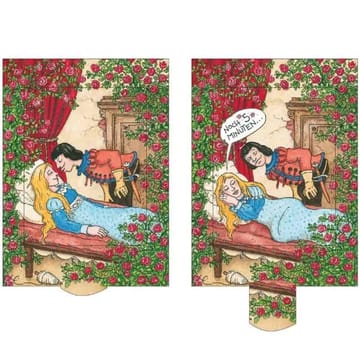 Sjovt dobbelt træk ud postkort - Rapunsel der ændrer motivet, når det trækkes.  Dette interaktive kort illustrerer  det klassiske Brødrene Grimm´s eventur, dog historien slutter ikke som forventet, da Rapunsel selv klipper sit hår af. Måske er ikke alle prinser så smukke, som de er malet.