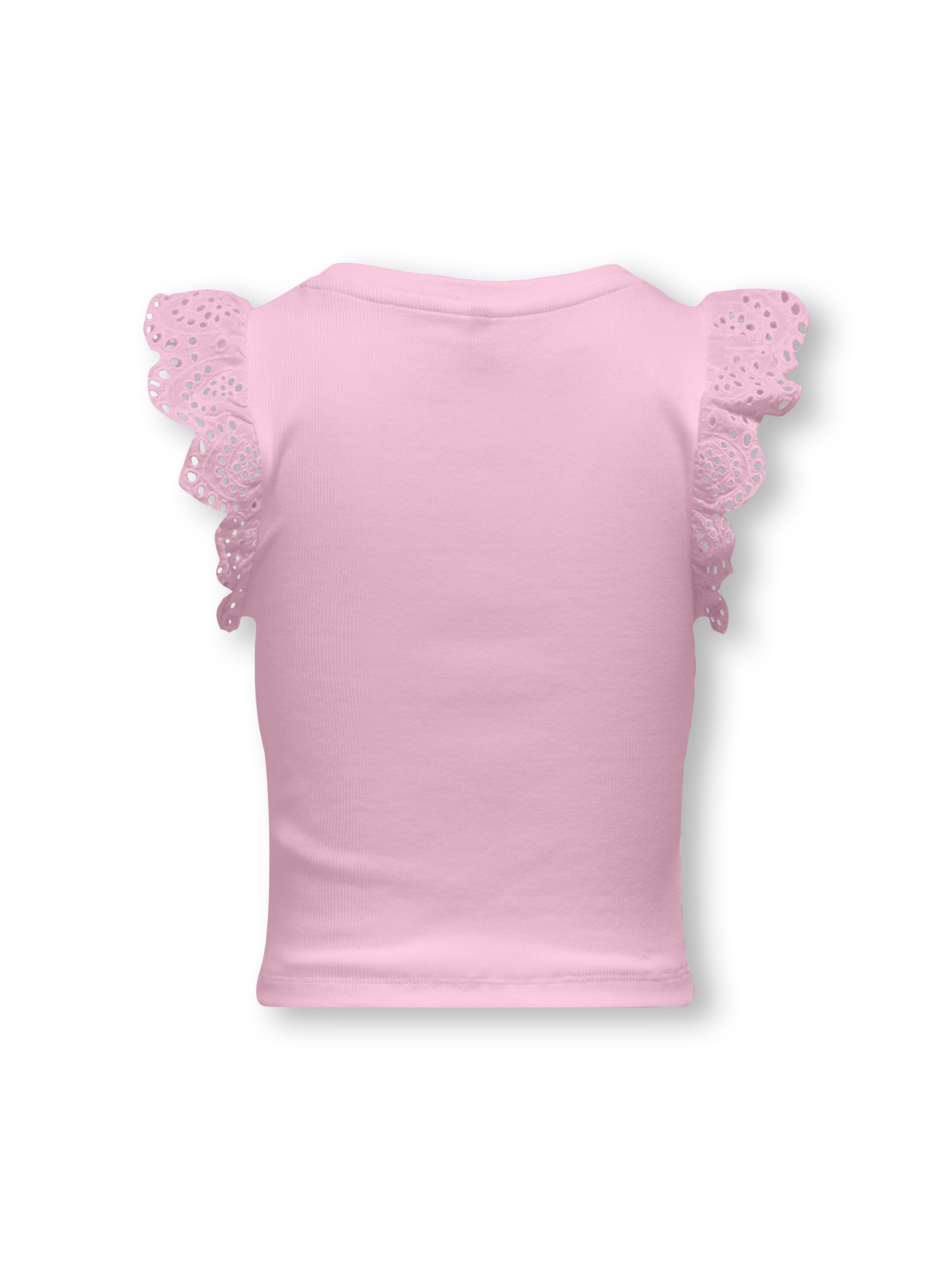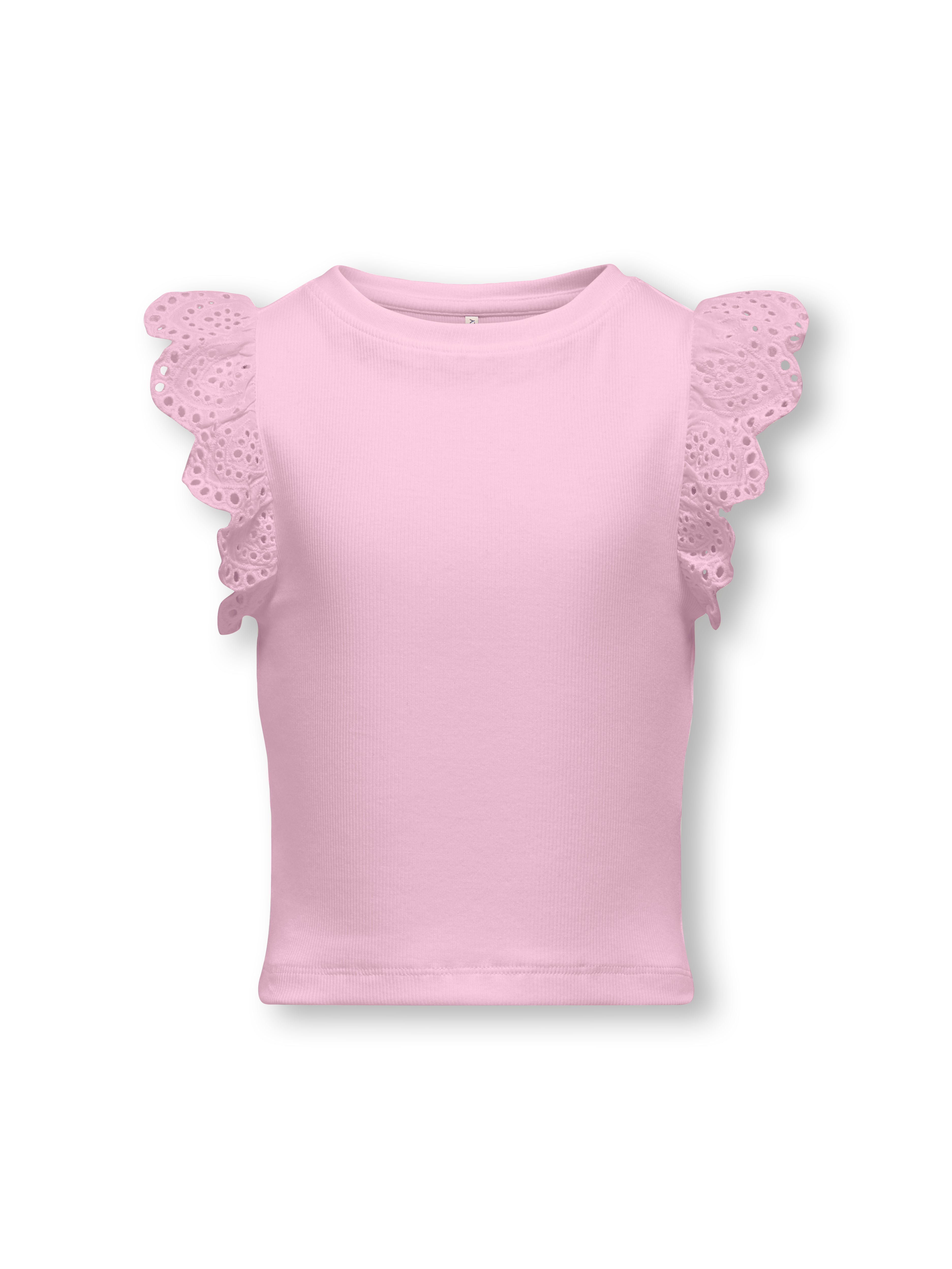 Denne søde top fra Only Girls kombinerer en klassisk og feminin stil med et legende touch. De flotte broderede flæser på skuldrene giver et unikt og charmerende udtryk, som gør toppen perfekt til både hverdag og festlige lejligheder.