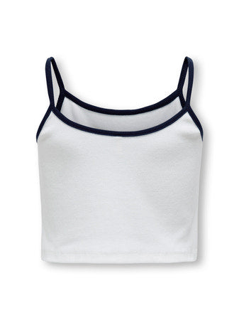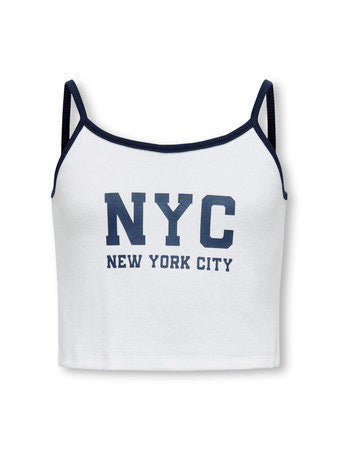 Cool top i hvid med blå kontrastkanter og teksten "NYC New York city" i en stor skrift på forsiden. Modellen er kort, har slanke skulderstropper og er lavet i en dejlig ribstruktur. Perfekt til en aktiv sommerdag!