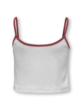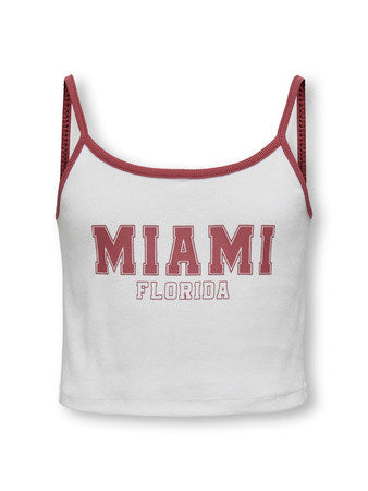 Cool top i hvid med bordeaux kontrastkanter og teksten "Miami Florida" i en stor skrift på forsiden. Modellen er kort, har slanke skulderstropper og er lavet i en dejlig ribstruktur. Perfekt til en aktiv sommerdag!