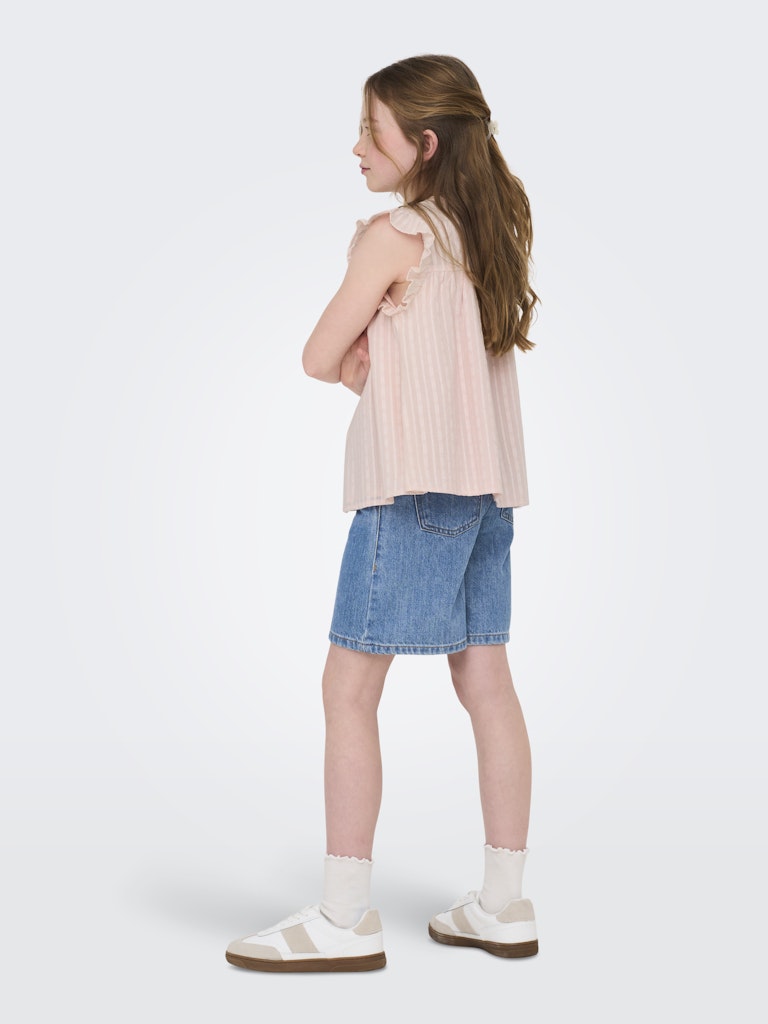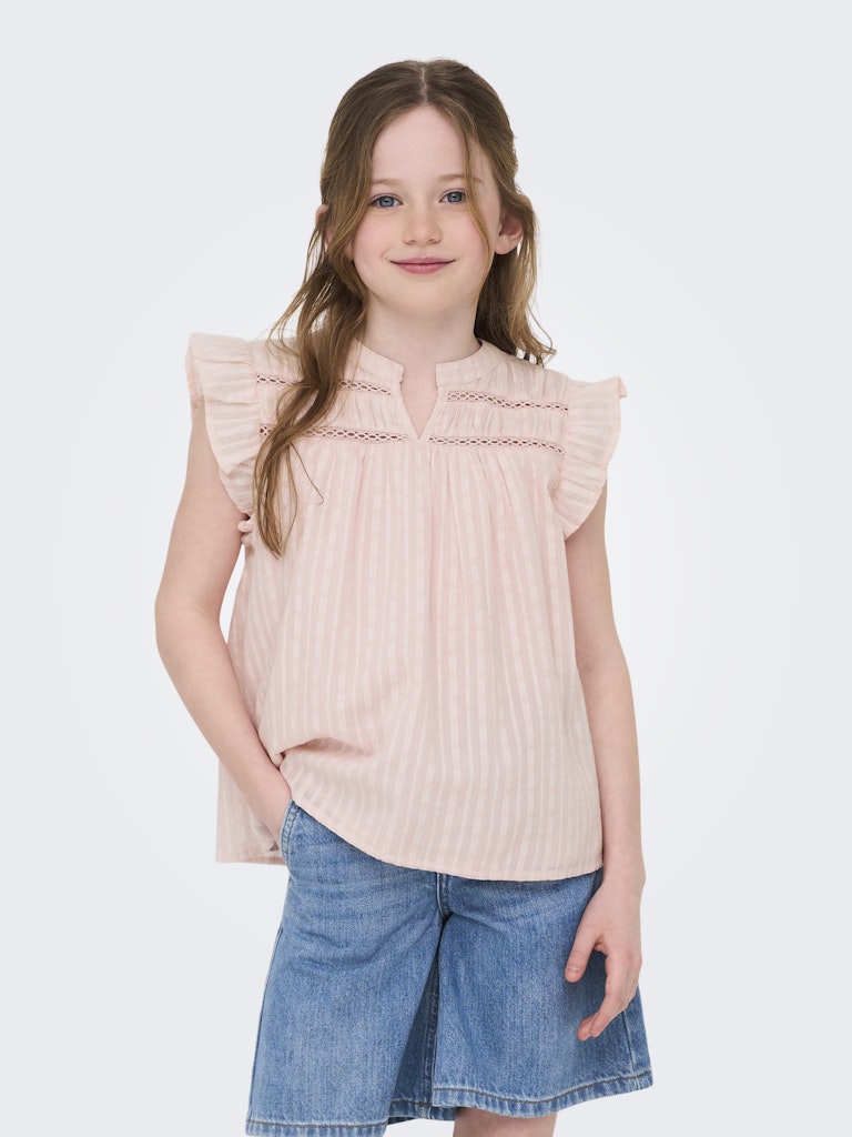 Denne flotte top i rosa med diskrete striber, flæser og en sød blondedetalje over brystet er utroligt fin og den oplagte tilføjelse til en ung piges klædeskab! Pasformen på den søde overdel er normal og blusen er ærmefri med en fin flæse på skulderen - let og luftigt, lige som man vil have det!