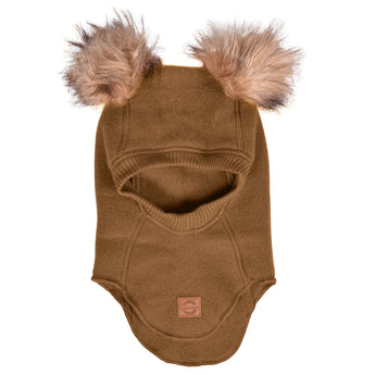 Rigtig sød elefanthue i uld fra Mikk-Line, med skønne pom pom'er. Her i den flotte varme lysbrune farve Rubber.