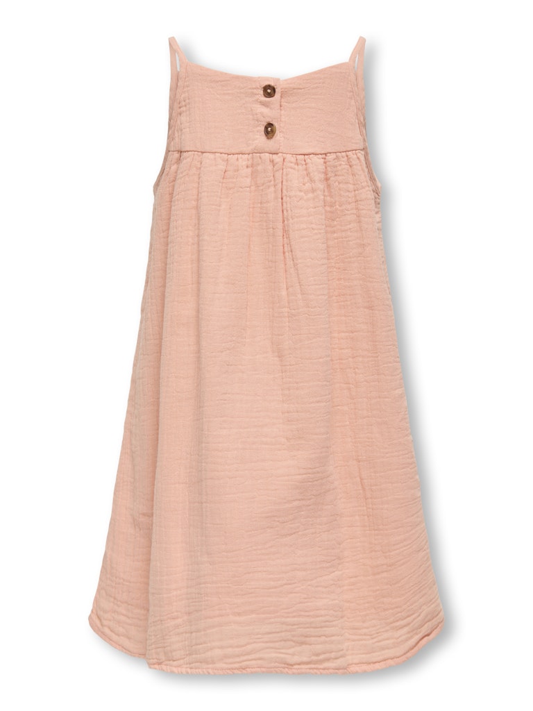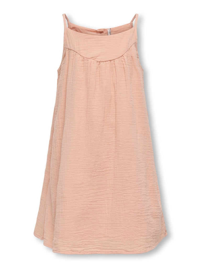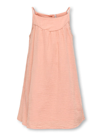 Denne søde sommerkjole fra Only Girls i farven koral/laks er den perfekte lette og luftige style til varme dage. Kjolen har en feminin og afslappet pasform, der giver masser af bevægelsesfrihed. Den er designet med tynde stropper og en smuk detalje med den krøllede struktur, som giver et fint og uformelt udtryk. Den delikate ferskenfarve gør den ekstra sommerlig og nem at style med både sandaler og sneakers.