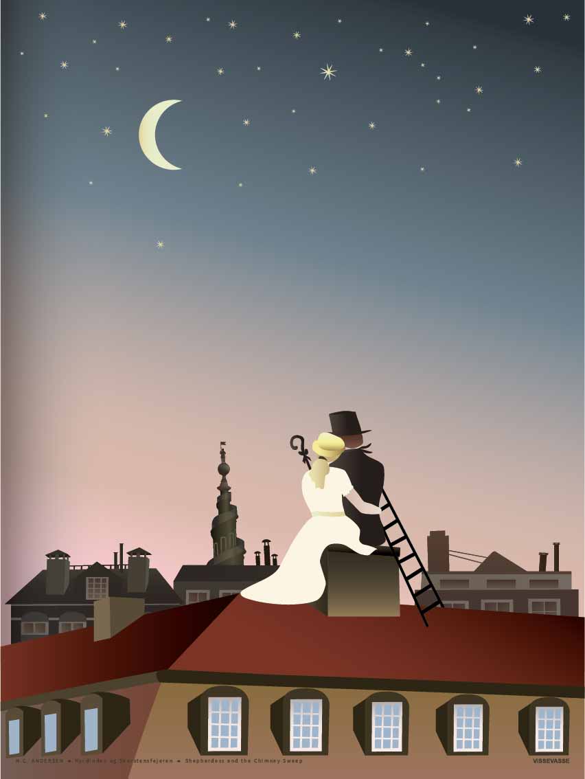 ”Hyrdinden og skorstensfejeren” handler om et forelsket par, som ikke kan få hinanden. De flygter ud i den store, vide verden gennem en skorsten og kigger på stjernerne over Københavns tage. Men verden er for stor og farlig, og de må tilbage til deres velkendte plads på kommoden. Heldigvis ender det med at det forelskede porcelænspar får hinanden.